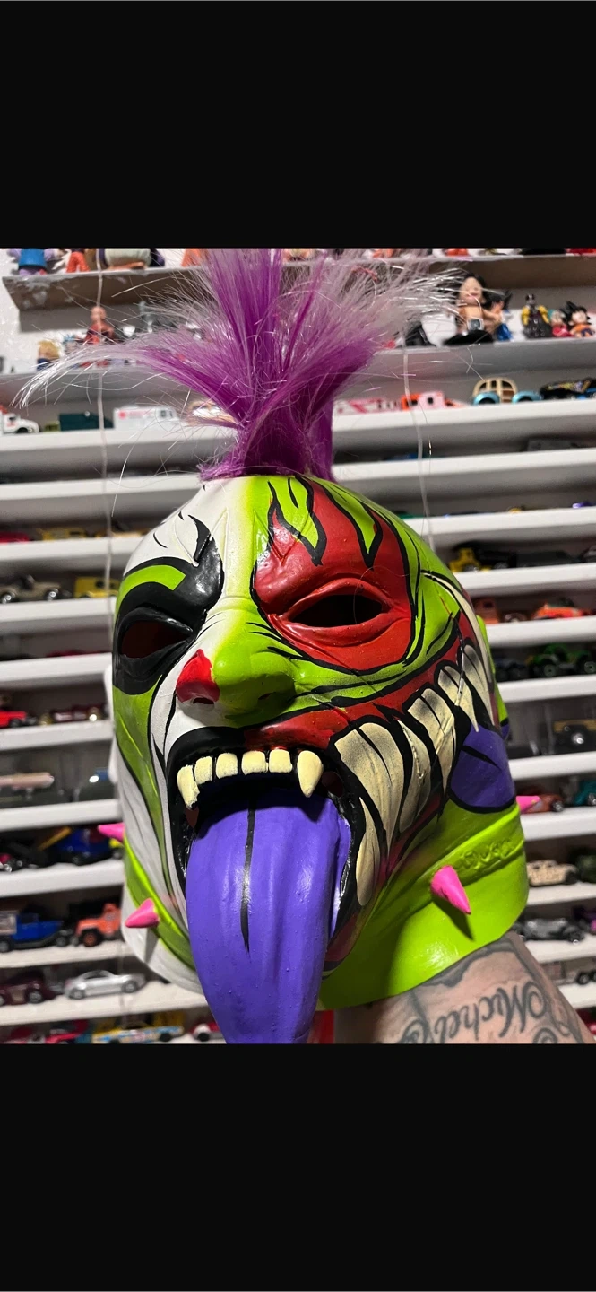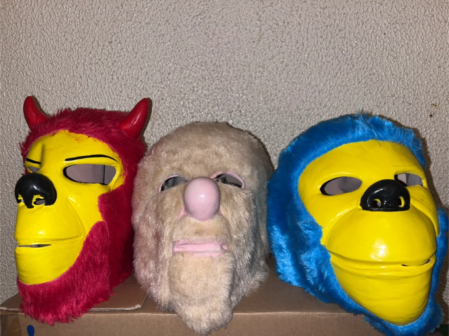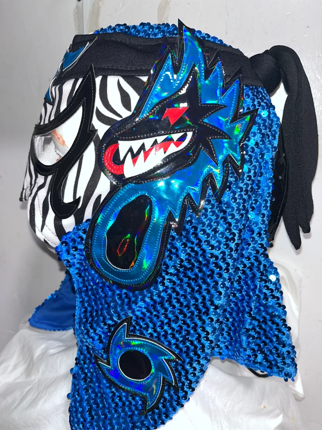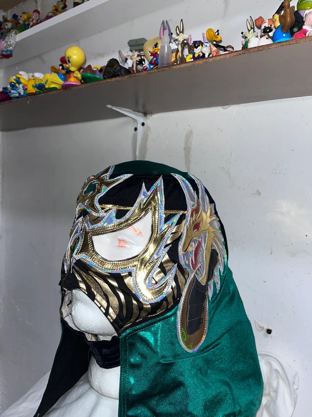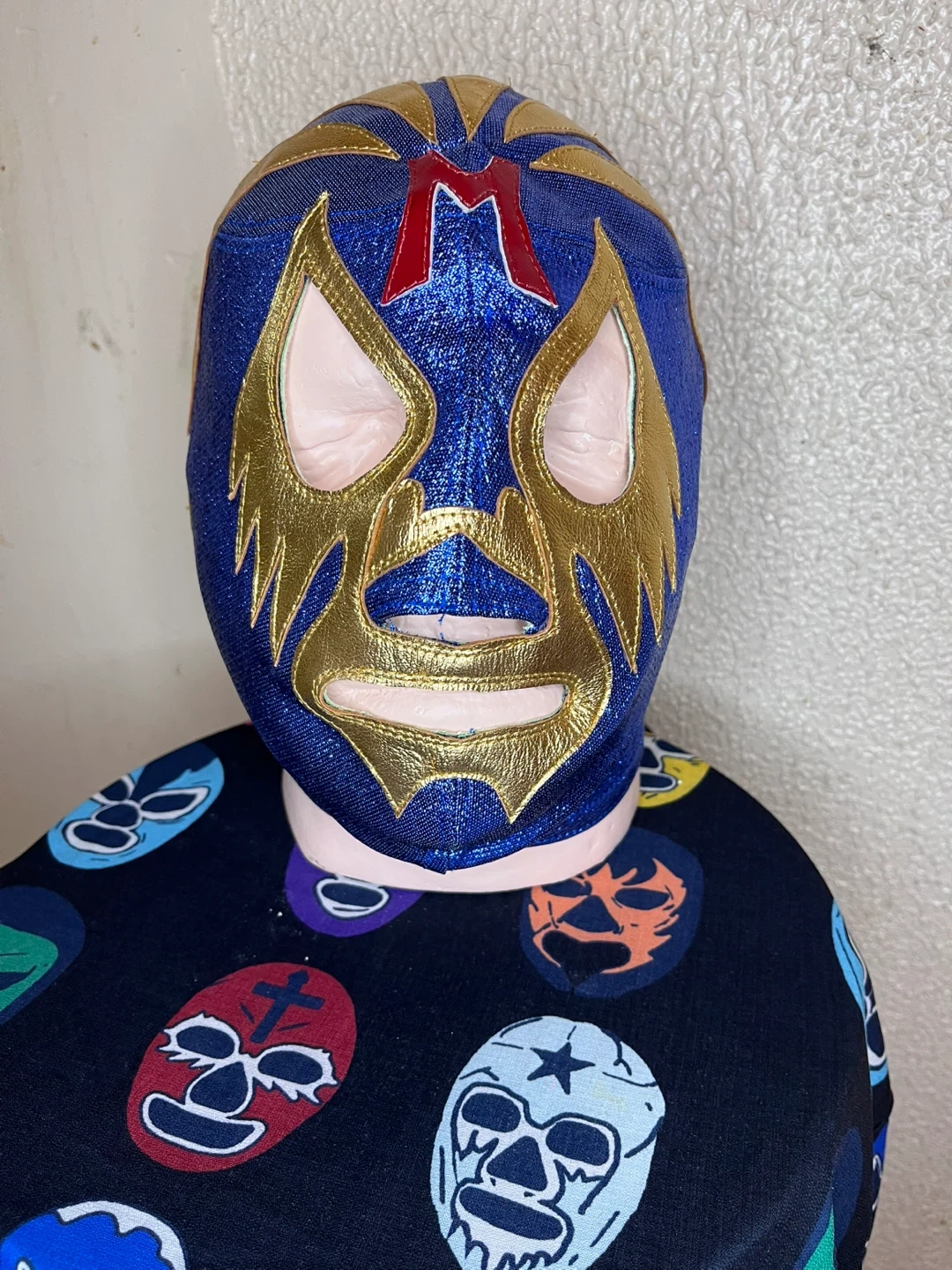 Assortment of Lucha Libre wrestling masks. Colorful designs include characters with gold accents, animal themes, and skull motifs. Fabric construction.