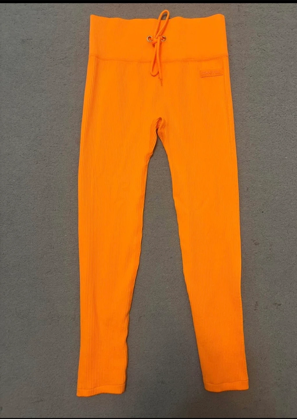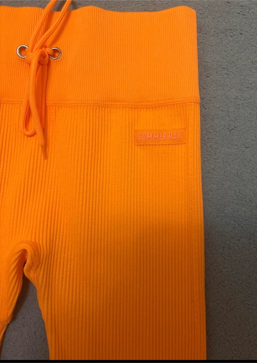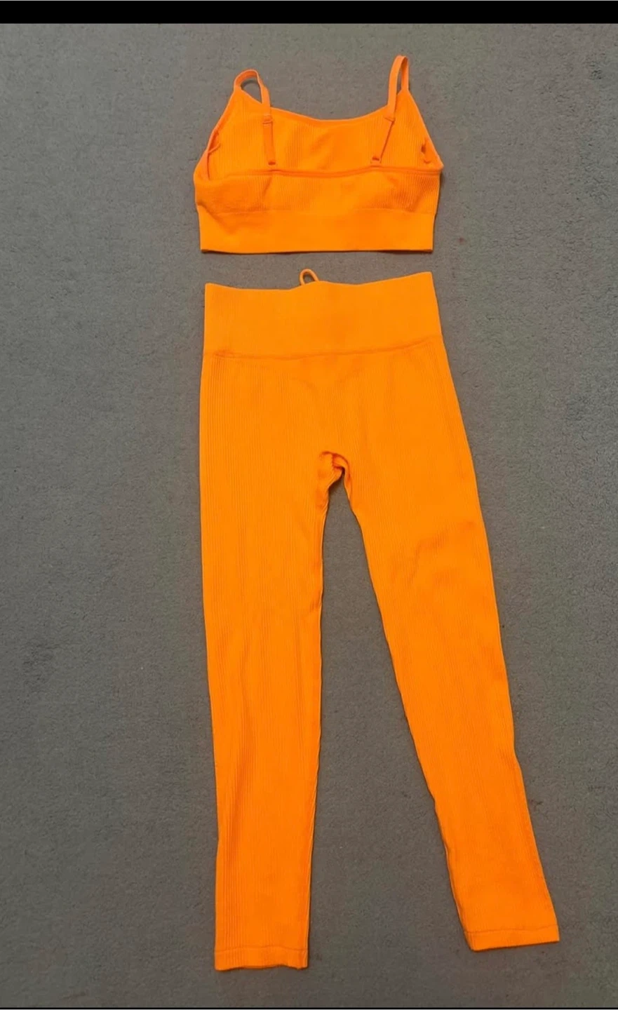 This vibrant orange ribbed set includes a sports bra and matching leggings. Both pieces feature the Sommer Ray branding. It's made from a stretchy, comfortable fabric perfect for workouts or casual wear. Fits size small.