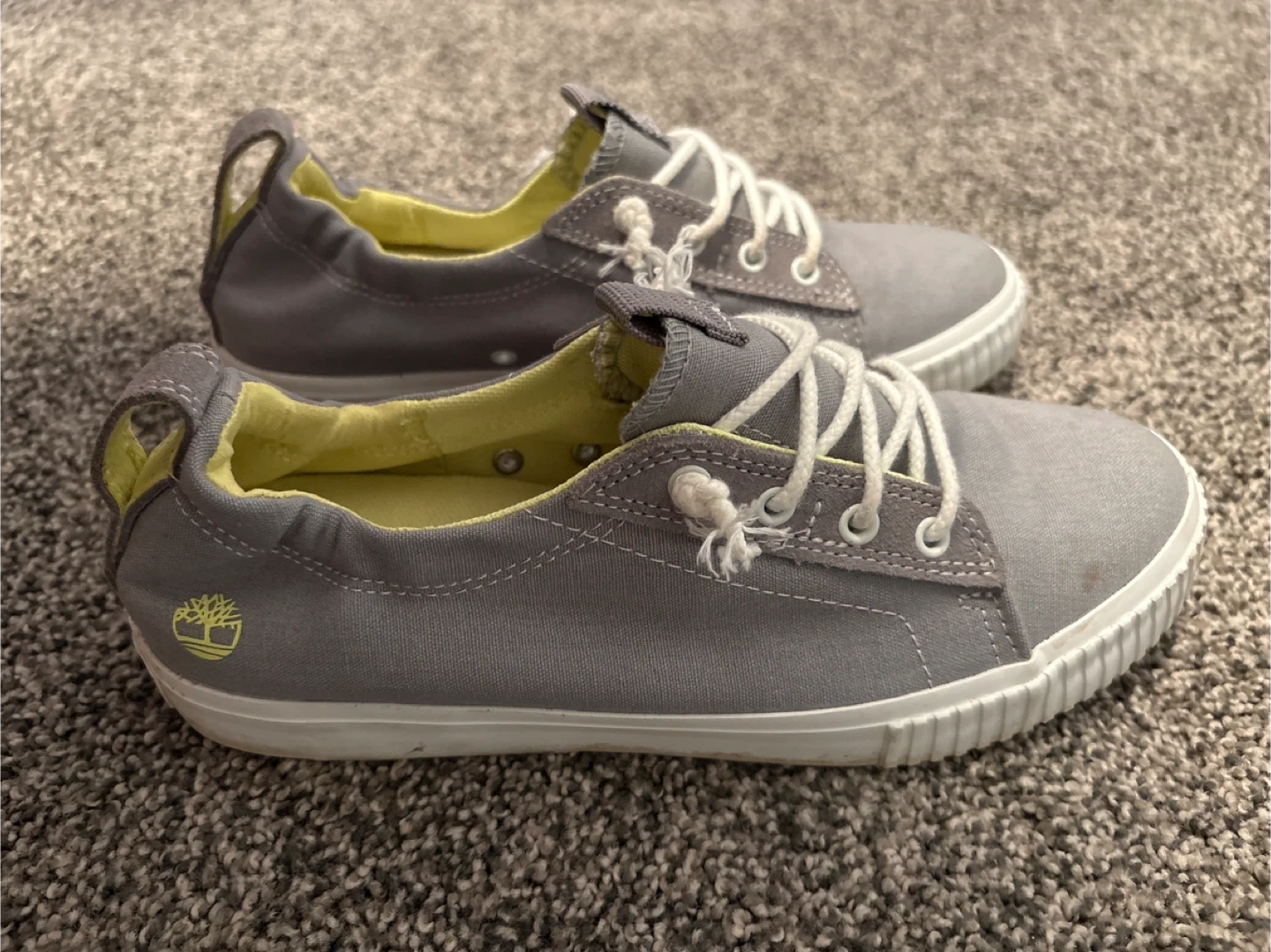 Timberland canvas sneakers in a nice grey colour with yellow accents. These are slip-on style with laces. They're comfy and casual. Only worn once, they were tight on me.