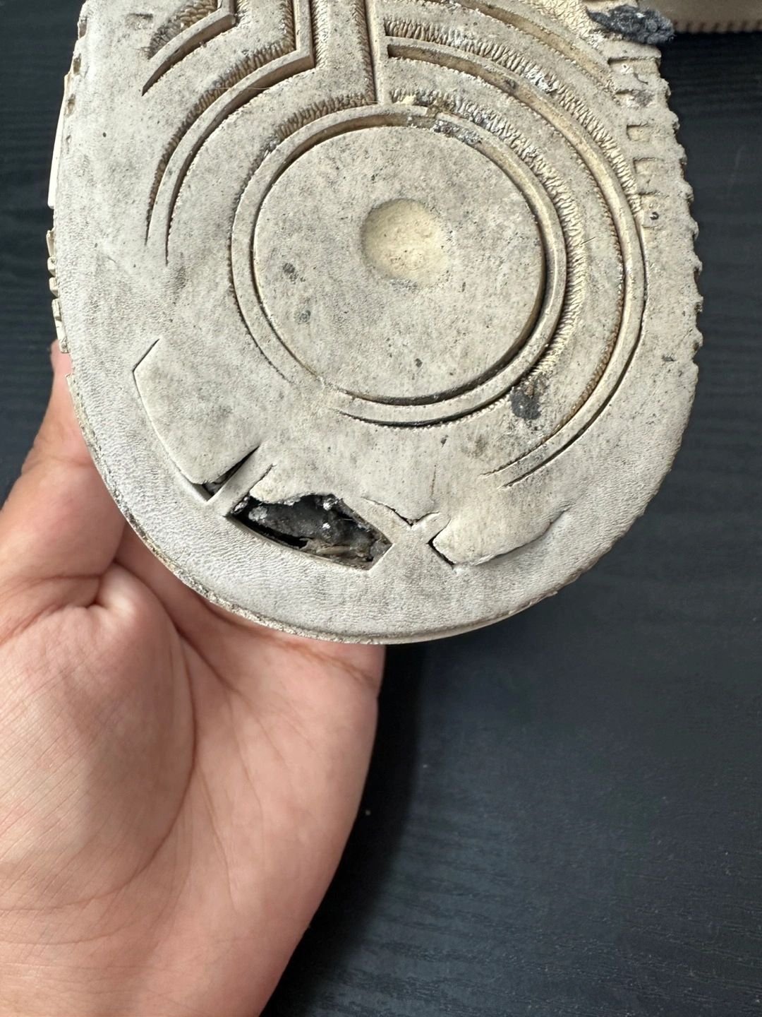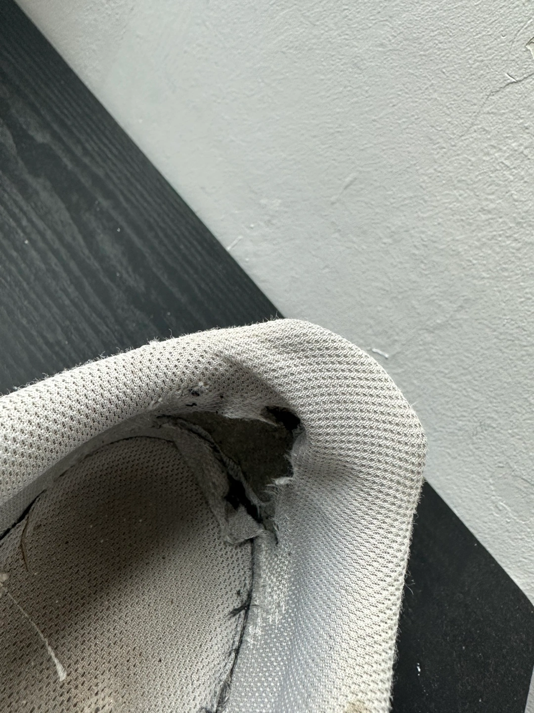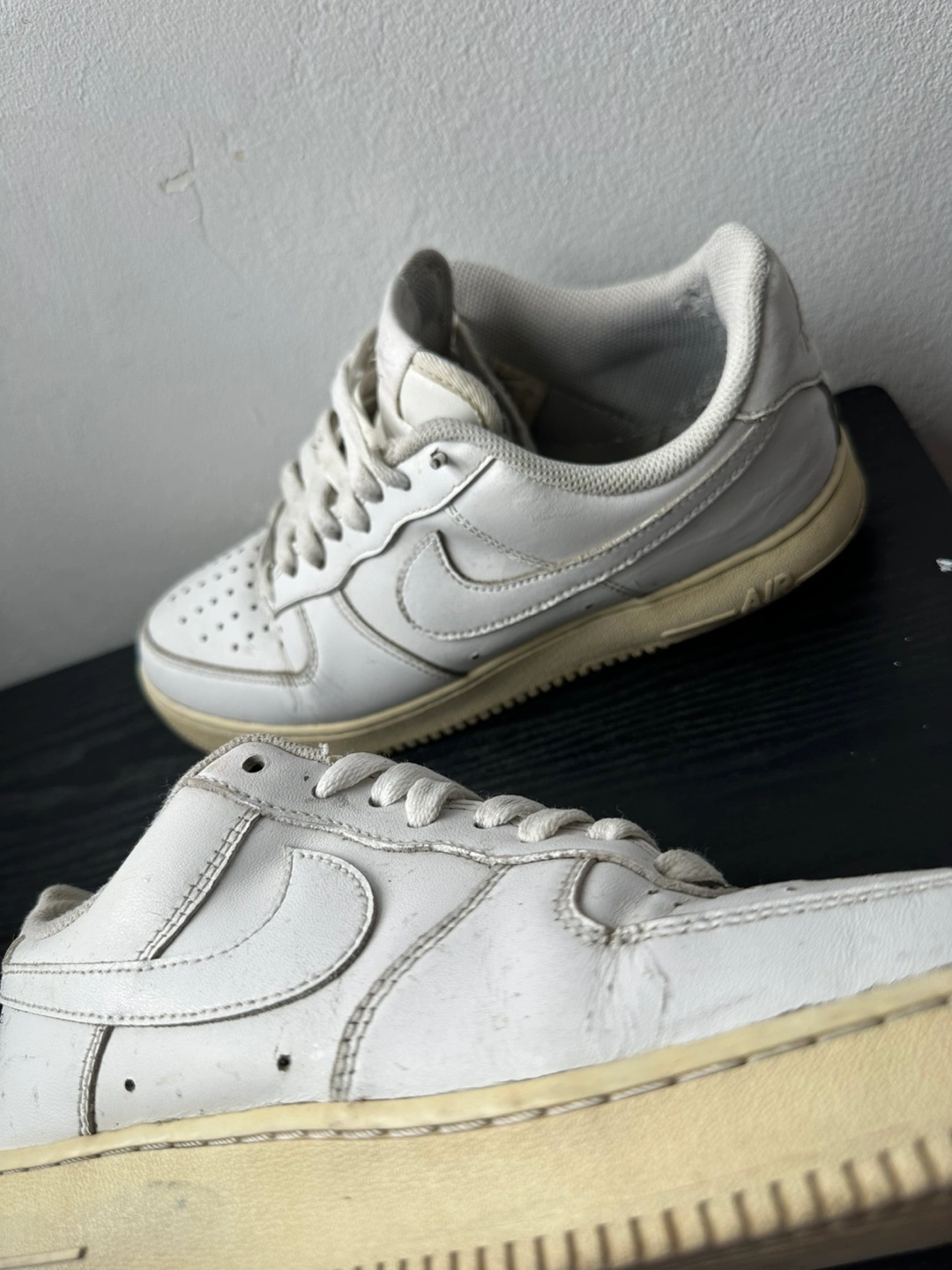 Selling a pair of Nike Air Force 1s that have seen better days. As you can see from the photos, there's some significant wear and tear, including a hole in the sole and damage to the inner lining.