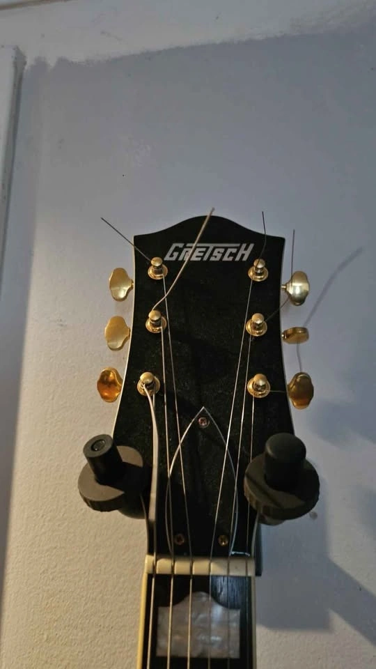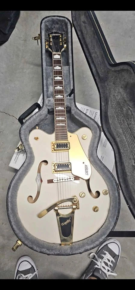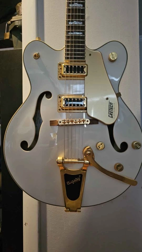 Stunning Gretsch G5422TG electric guitar. This is a beautiful white hollow body with gold hardware and a Bigsby tremolo. It has a classic look and sounds great. Comes with its hard case.