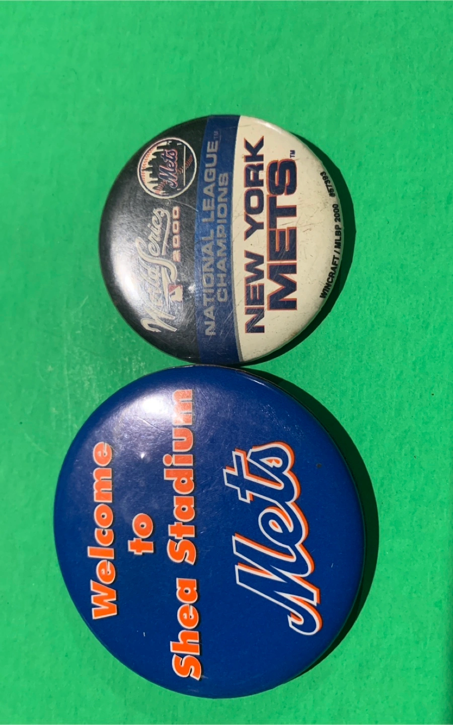 Two New York Mets buttons. One features the team logo and 'Welcome to Shea Stadium'. The other shows the 2000 National League Champions logo. Great for collectors.
