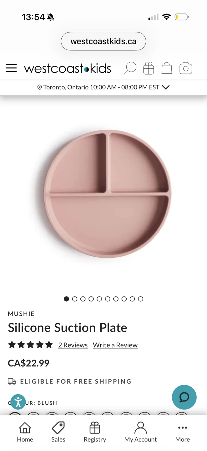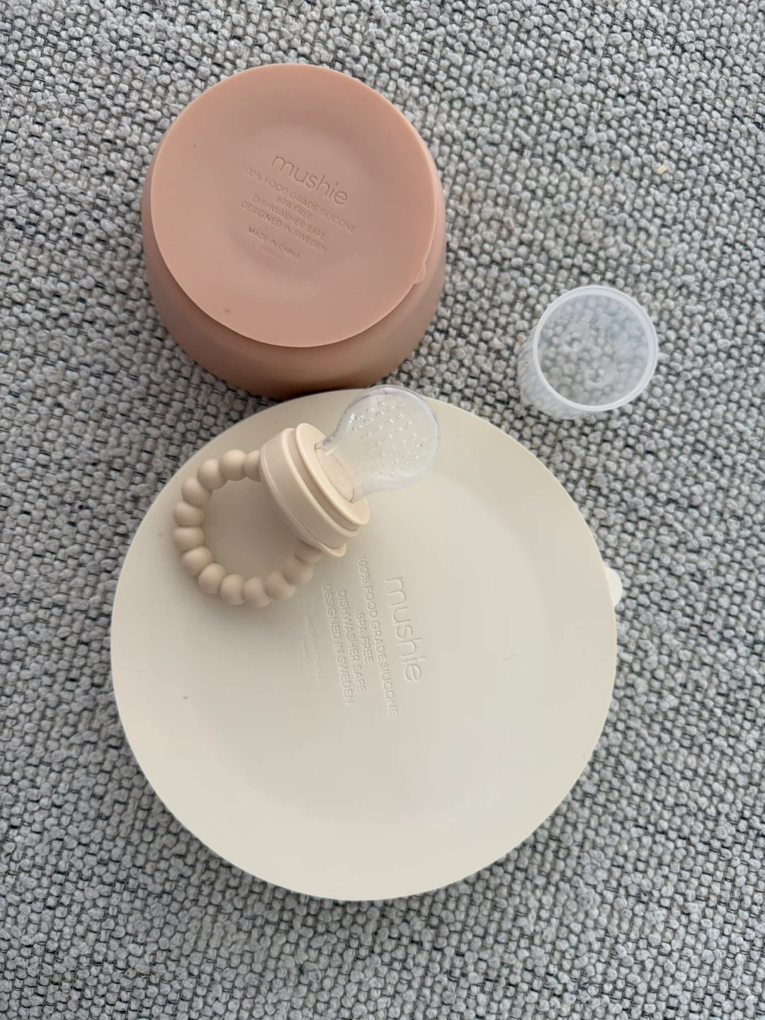 This Mushie silicone set includes a suction bowl, a divided suction plate, and a soft-grip spoon. All pieces are made from 100% food-grade silicone. Dishwasher safe. Designed in Sweden.