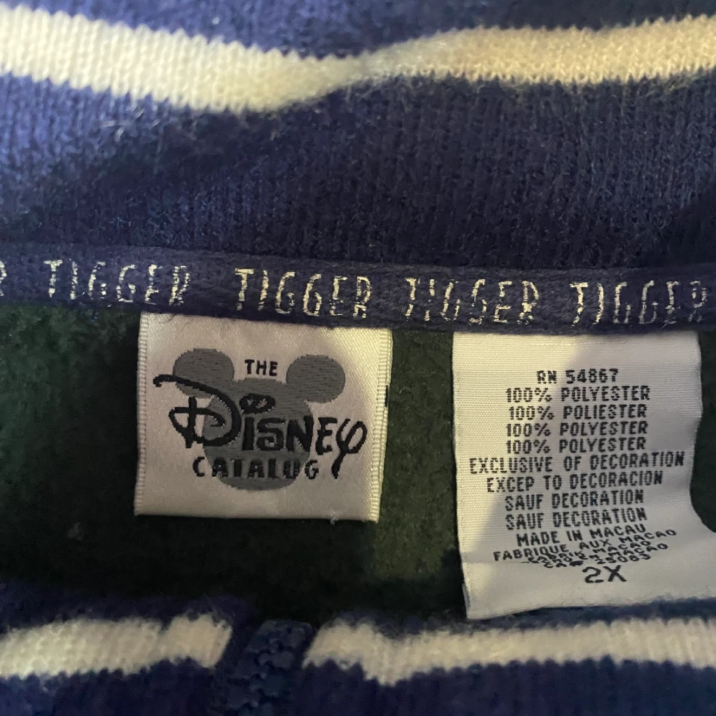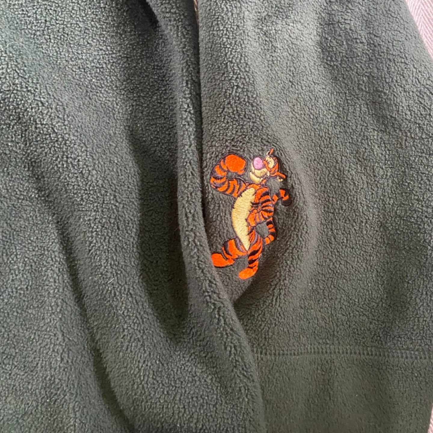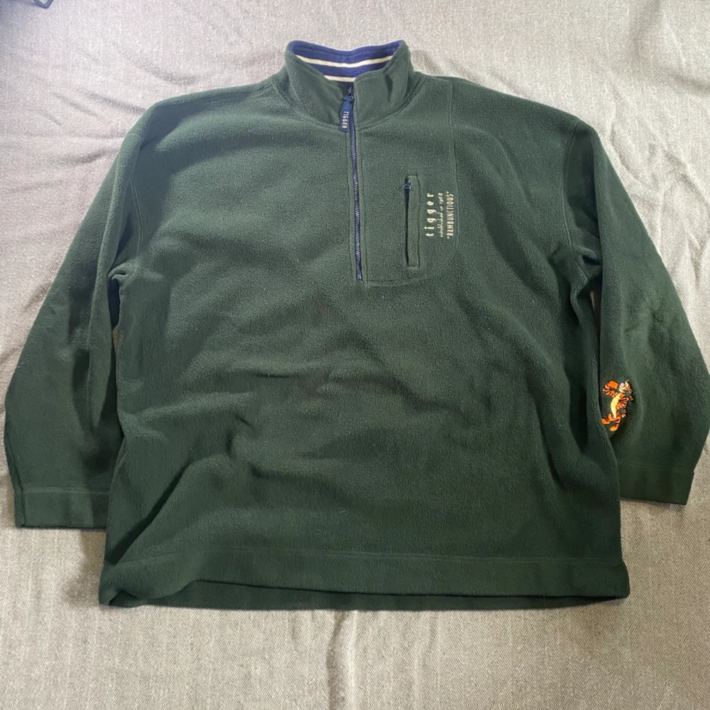Vintage Green Tigger fleece pullover from The Disney Catalog. It's made of 100% polyester with a quarter-zip closure and embroidered Tigger on the sleeve. Size is 2X. Made in Macau.