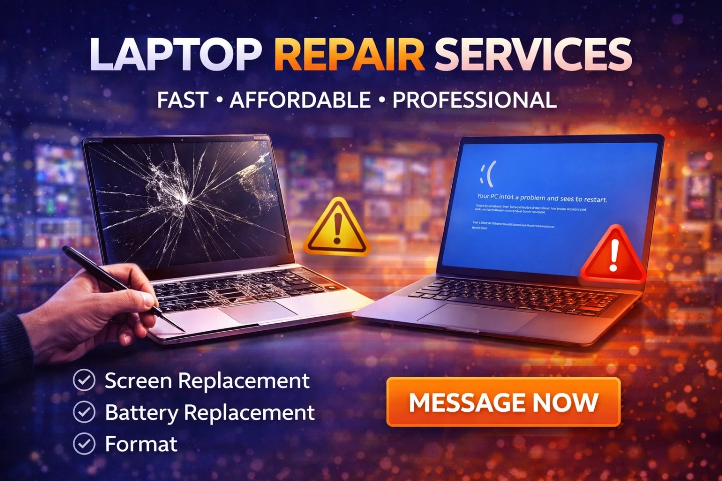 Fast, affordable, and professional laptop repair services are available. We offer screen replacement, battery replacement, and formatting to get your device running smoothly again. Message us now to book your repair!