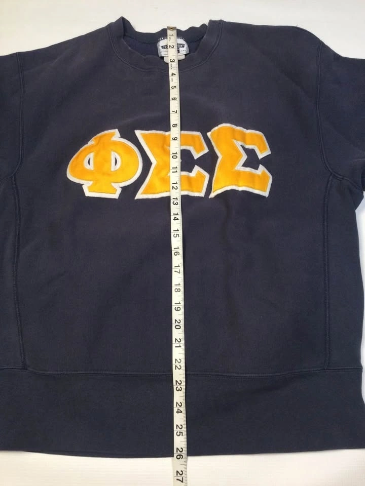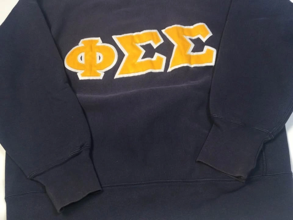 Vintage Lee Phi Sigma Sigma sweatshirt. Dark gray/navy color with yellow and white Greek letters. Size M. The sweatshirt is in vintage condition, there is some color change, as well as fraying on the edges of the sleeves. Cash only, public meetup in Manhattan / Hell's Kitchen.