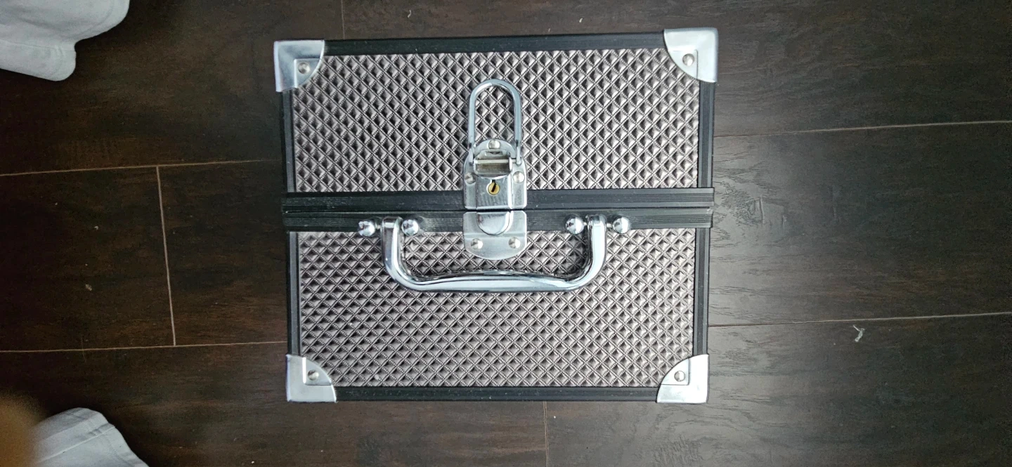 Selling a black makeup or jewelry box. It has a textured exterior and a patterned interior with multiple compartments. It's in great condition and ready for a new owner!