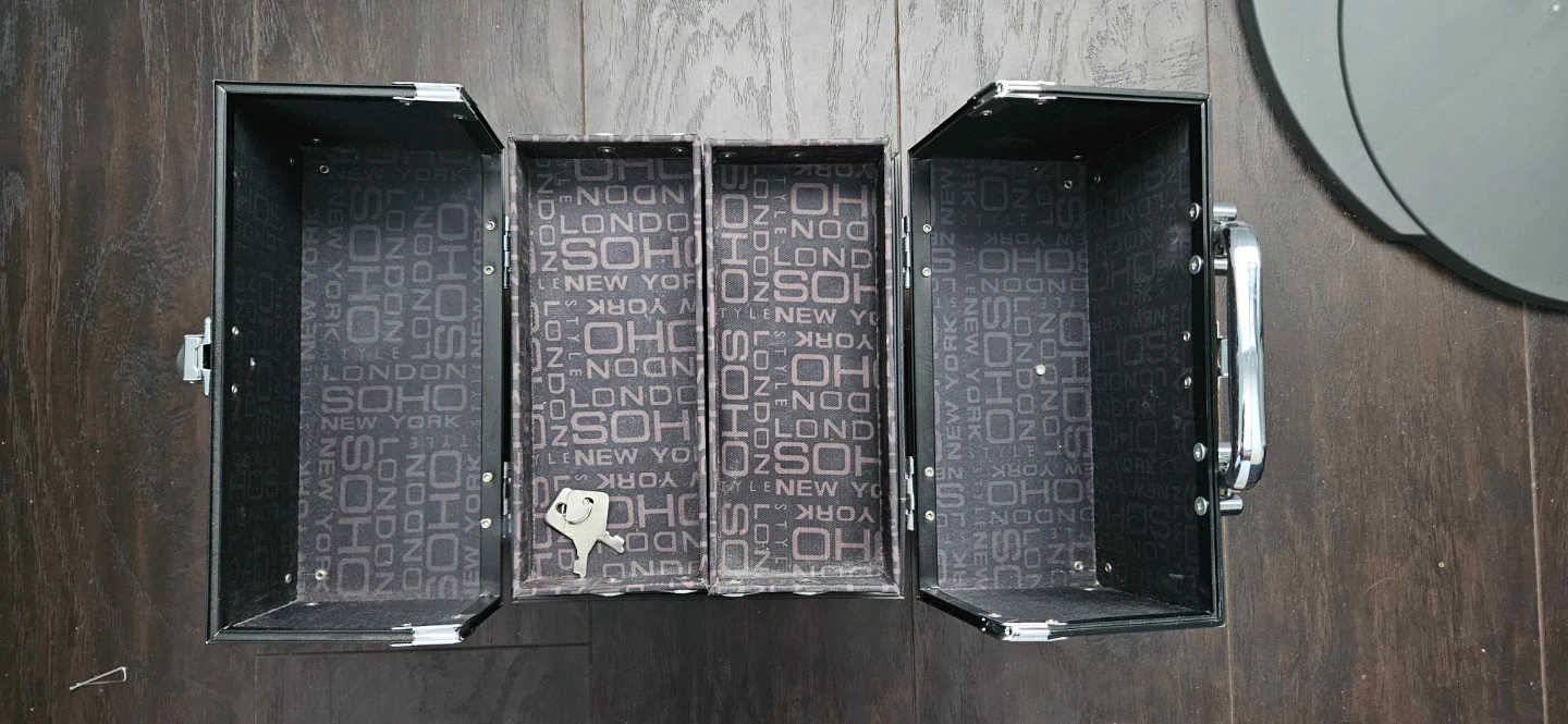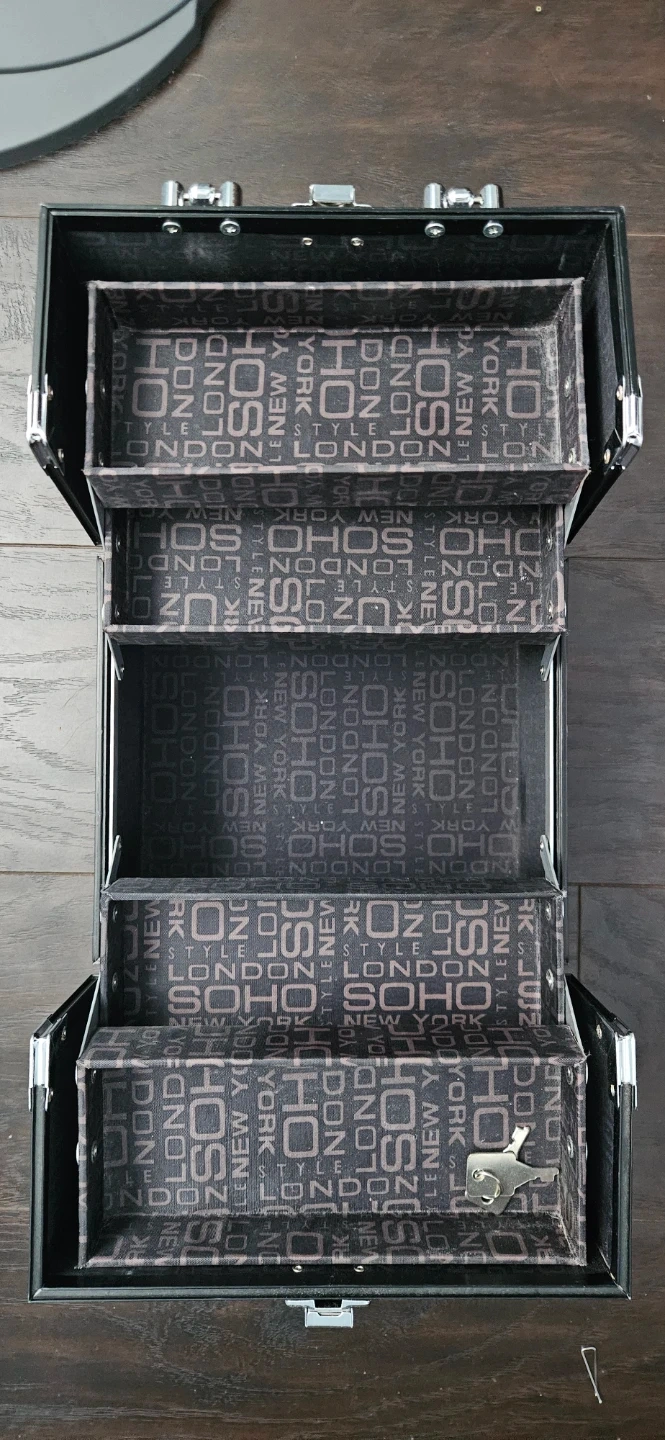 Selling a black makeup or jewelry box. It has a textured exterior and a patterned interior with multiple compartments. It's in great condition and ready for a new owner!