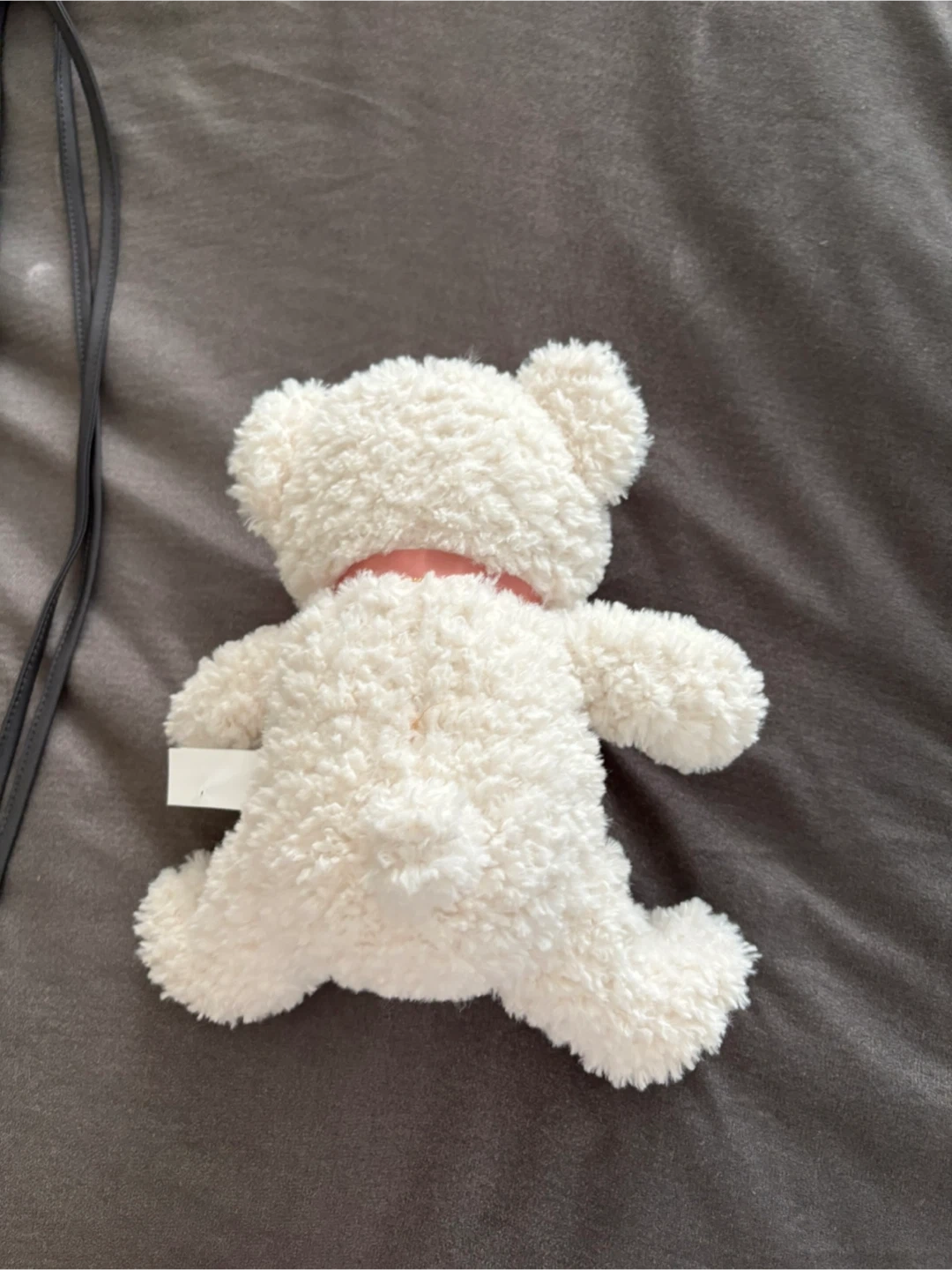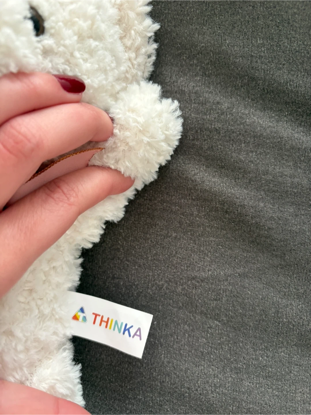 This is a soft, white teddy bear from Thinka. It has a pink ribbon around its neck and 'love' embroidered on its paw. It's a sweet plush toy.