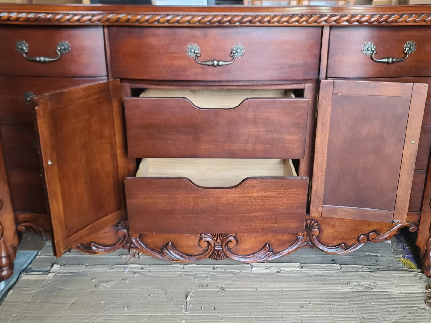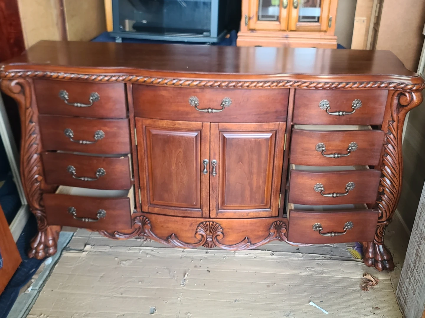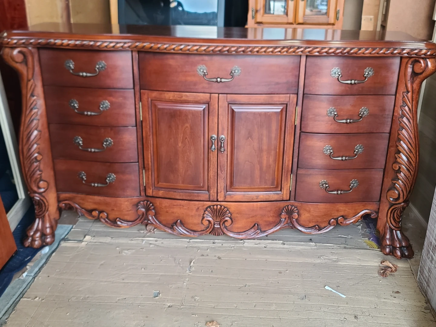 Beautiful wood dresser and mirror set. Has ornate carvings and cool rope trim along the top. 8-side drawers and two cabinet doors with two more drawers inside. Claw feet are a nice touch. Mirror has matching carved frame. Great for bedroom or dining room. Measurements to follow. Viewing and pickup by appointment.