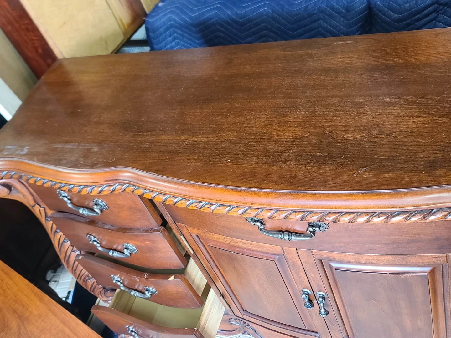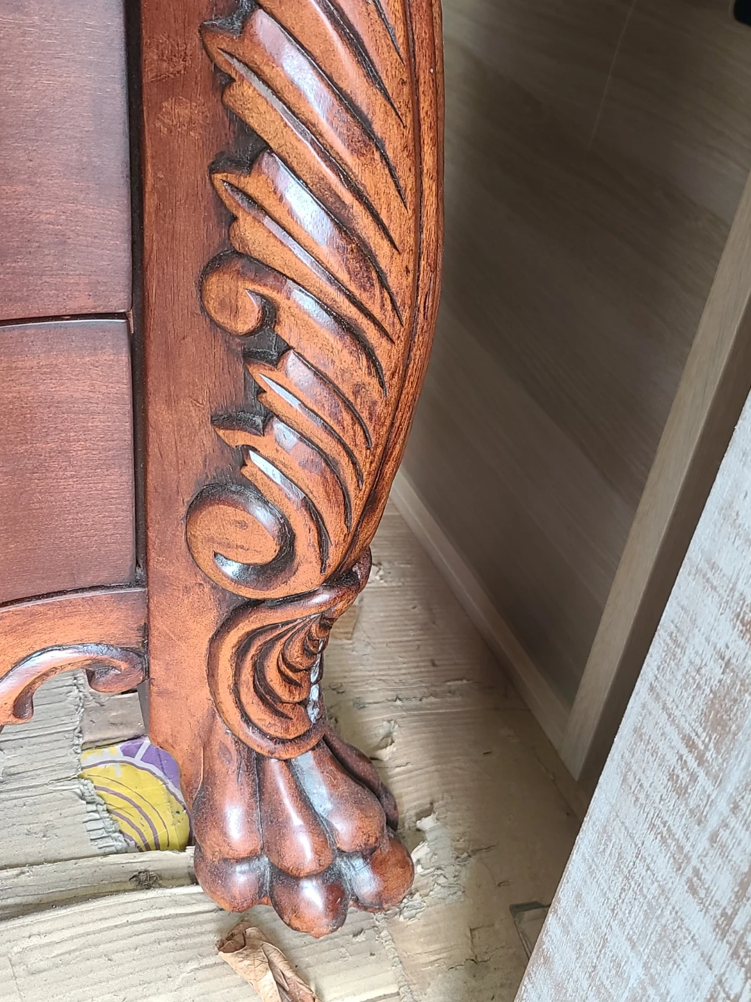 Beautiful wood dresser and mirror set. Has ornate carvings and cool rope trim along the top. 8-side drawers and two cabinet doors with two more drawers inside. Claw feet are a nice touch. Mirror has matching carved frame. Great for bedroom or dining room. Measurements to follow. Viewing and pickup by appointment.