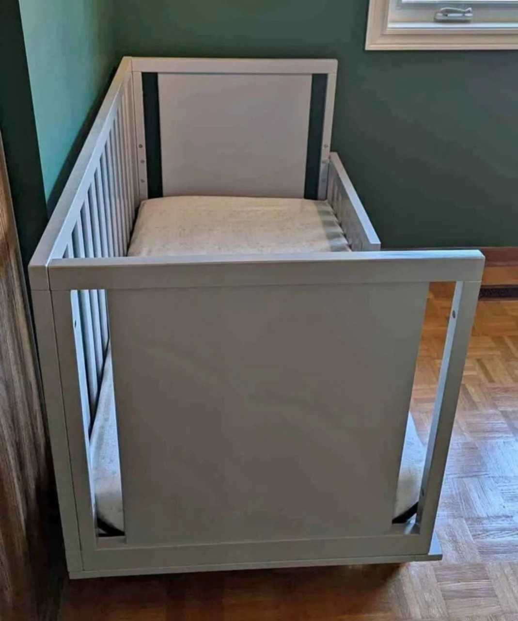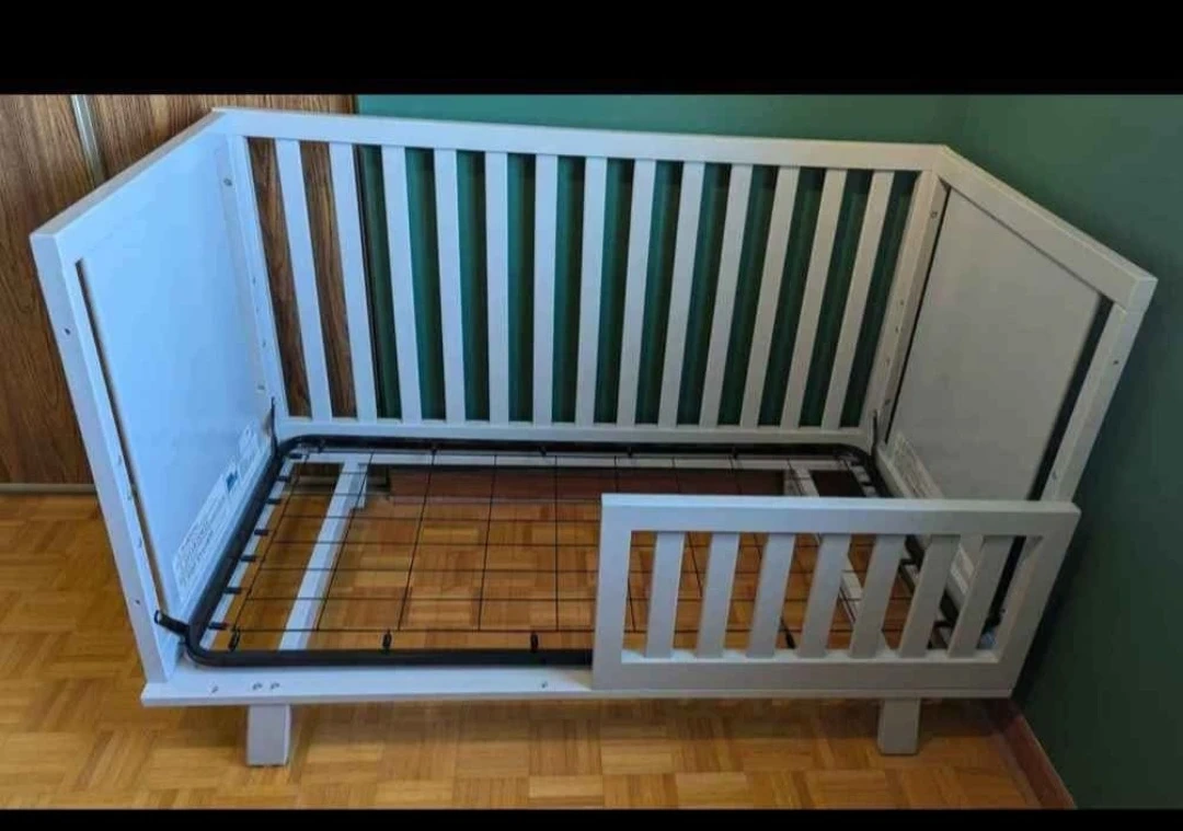 Selling a convertible baby crib in a neutral grey color. The crib is in great condition, clean, and well maintained. It easily converts into a toddler bed, making it a practical and long lasting piece as your child grows. Suitable for both boys and girls and fits well with any nursery decor.