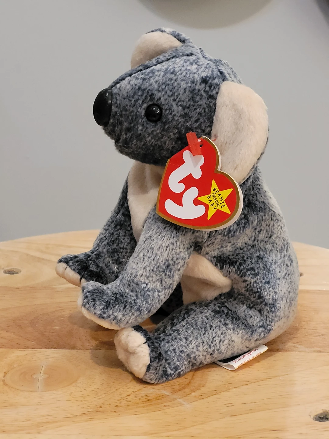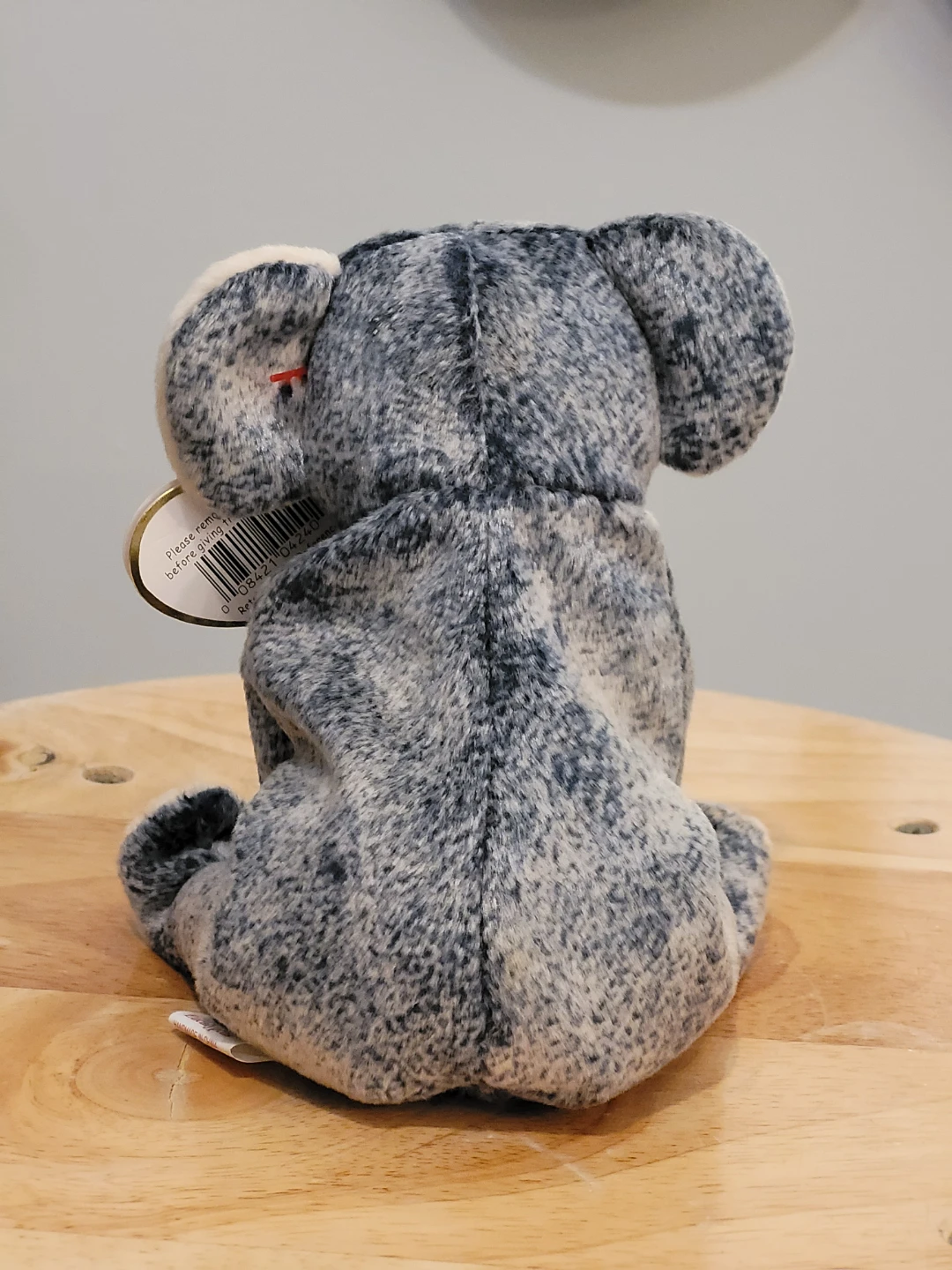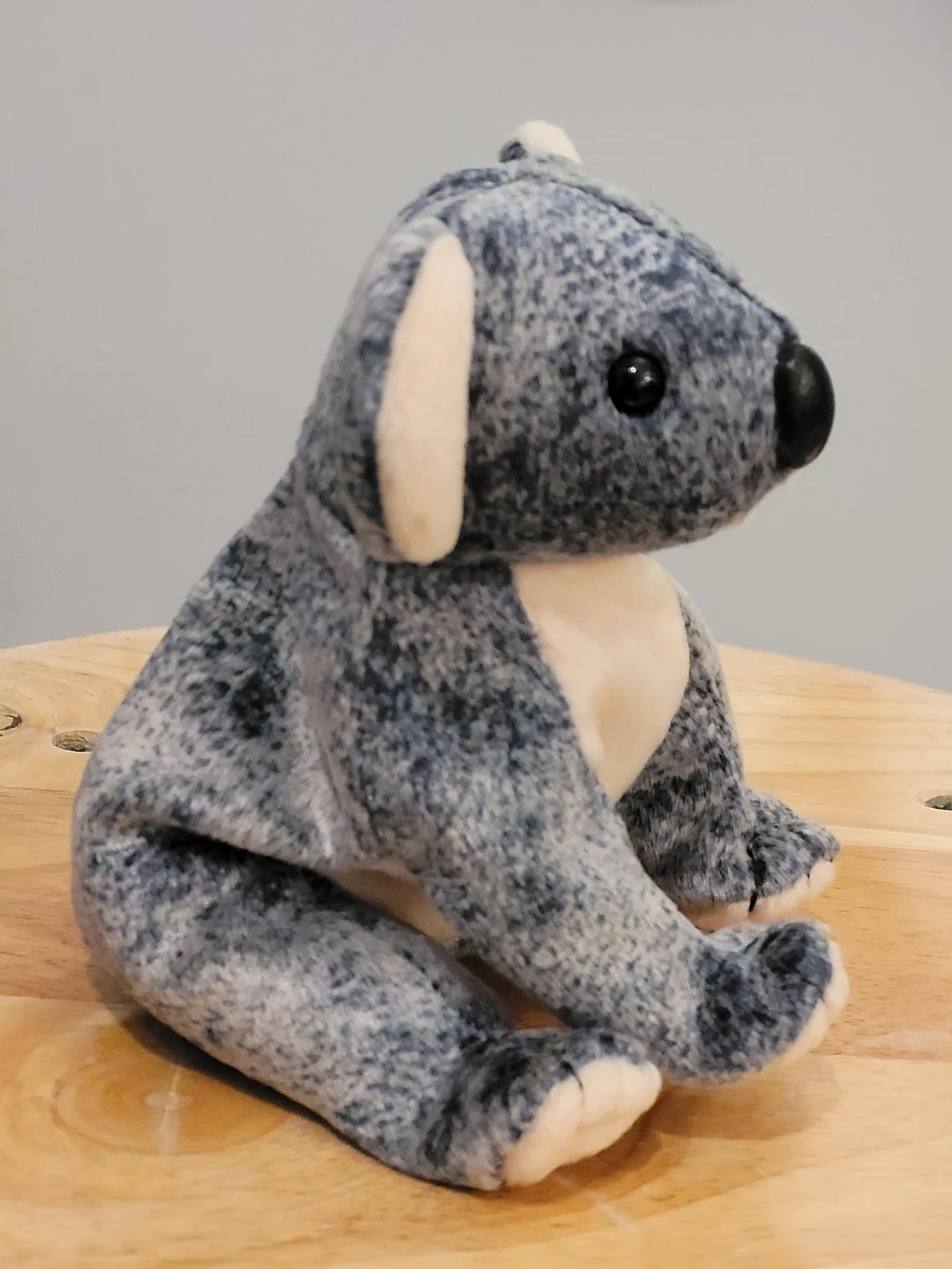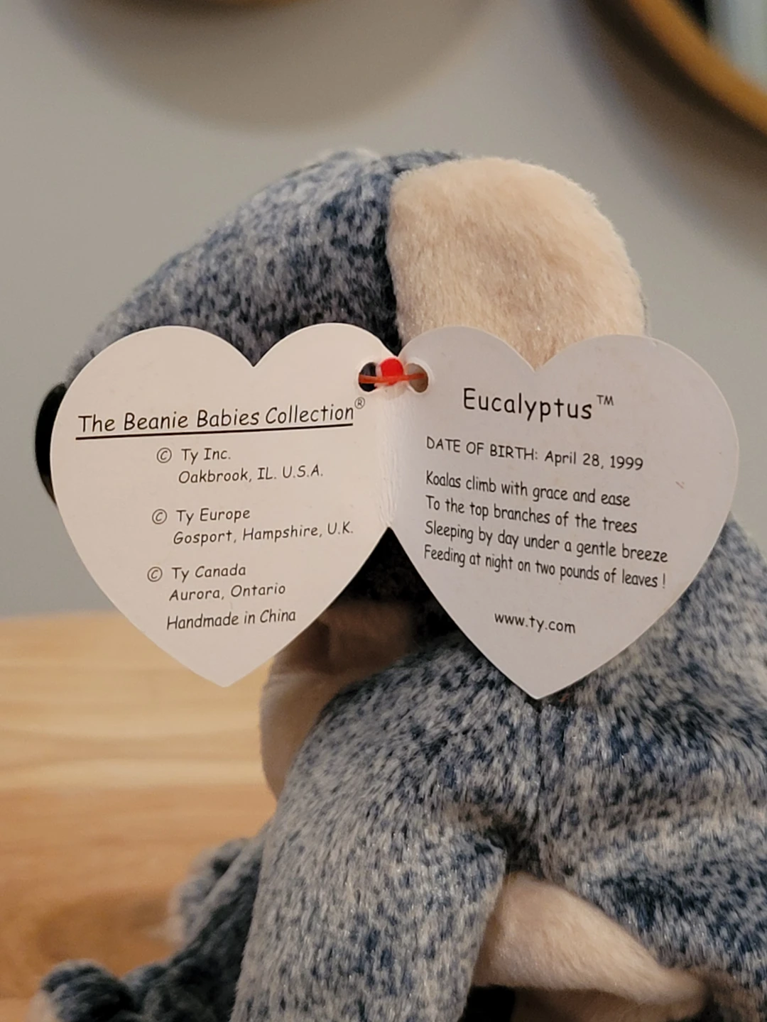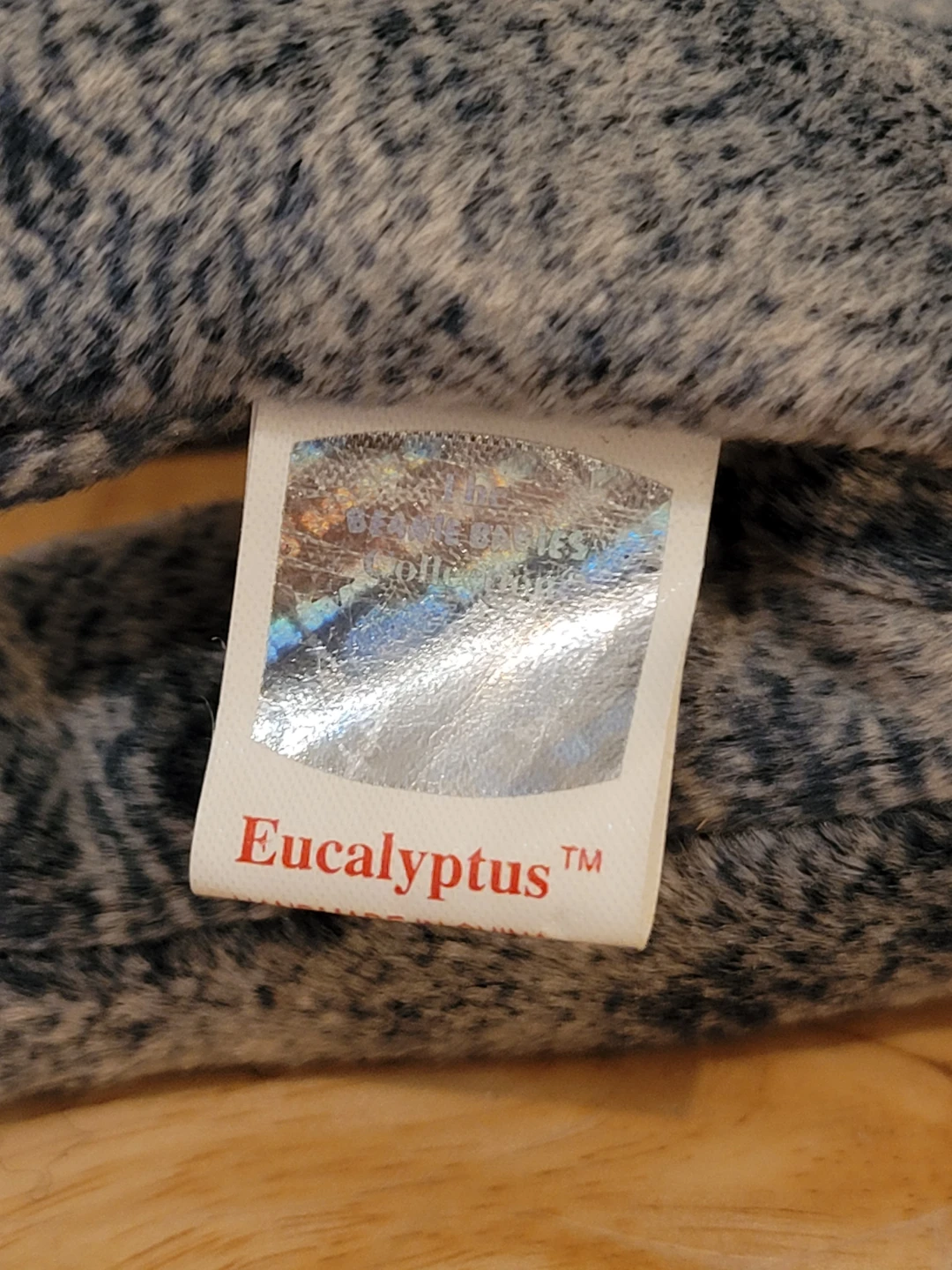 Ty Beanie Baby Eucalyptus the Koala is a retired plush toy from 1999. The toy is mottled gray with a cream-colored belly, paws, and inner ears. Its birthday is April 28, 1999.