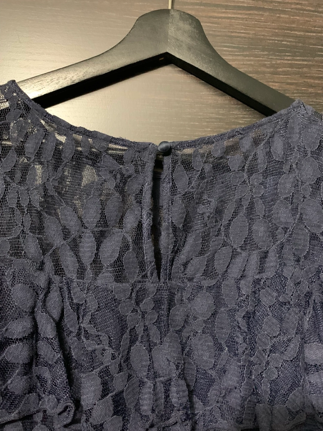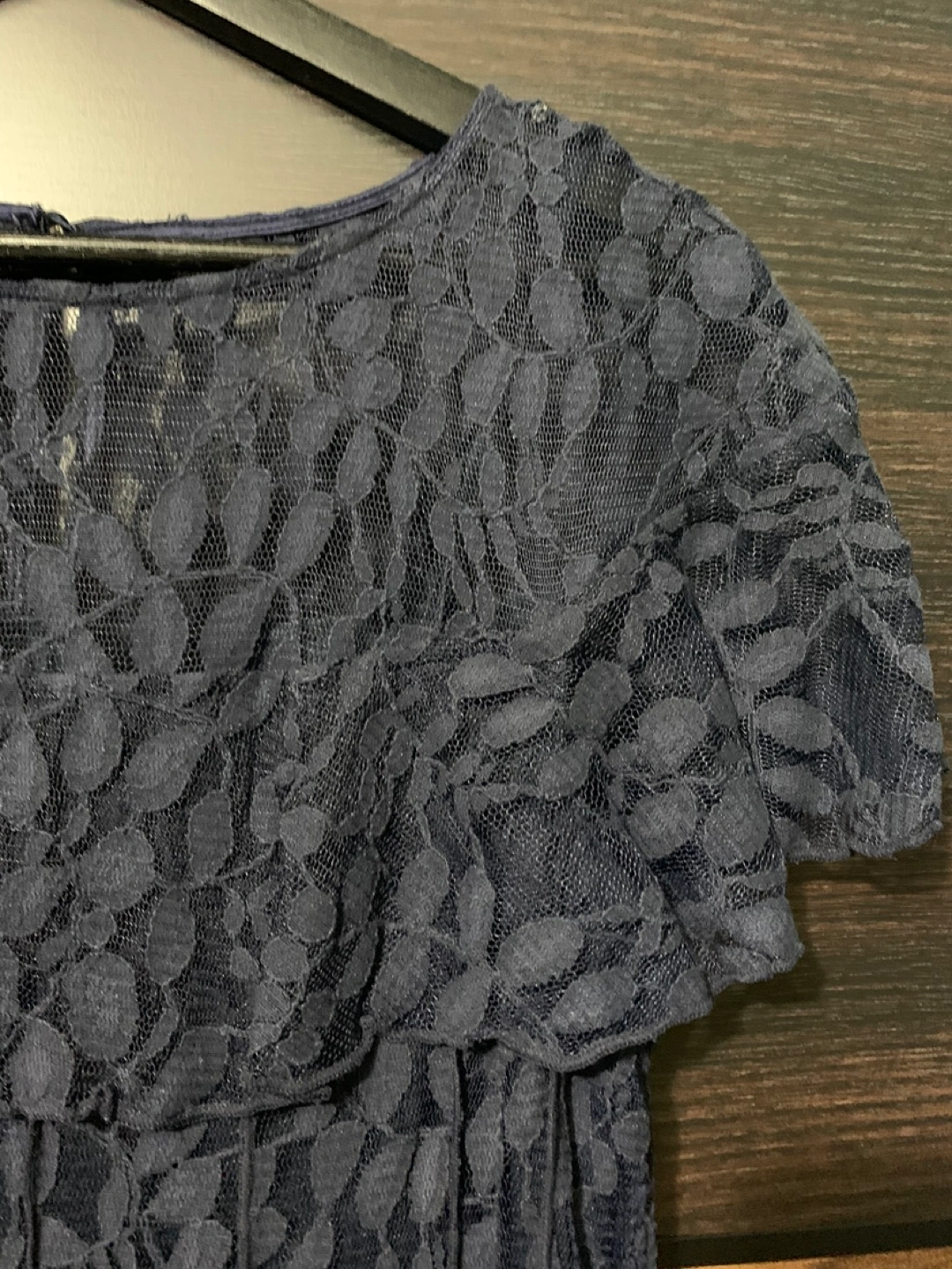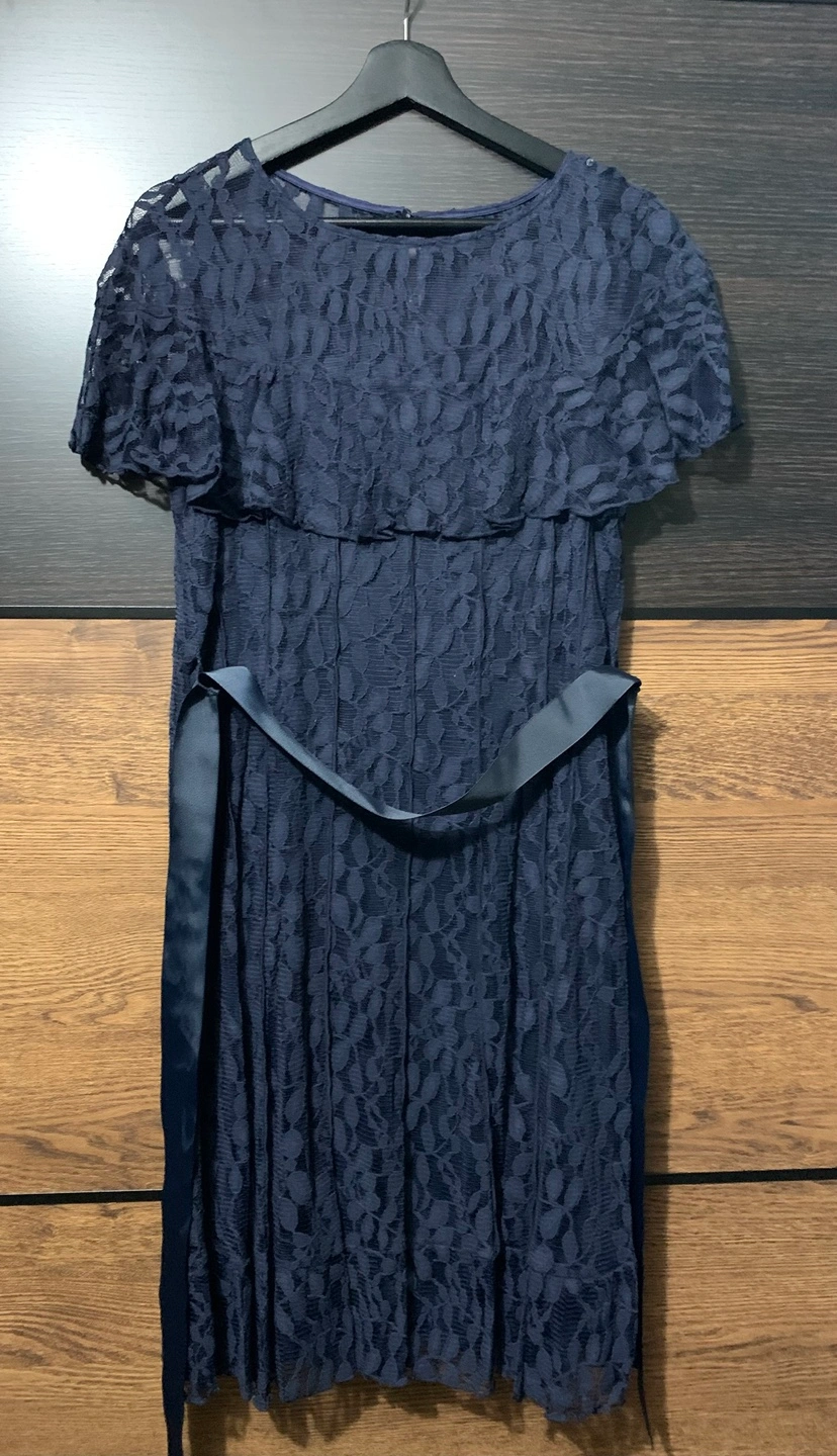 Beautiful navy blue lace dress. Features a flattering A-line silhouette, short flutter sleeves, and a matching ribbon belt. Size 10.