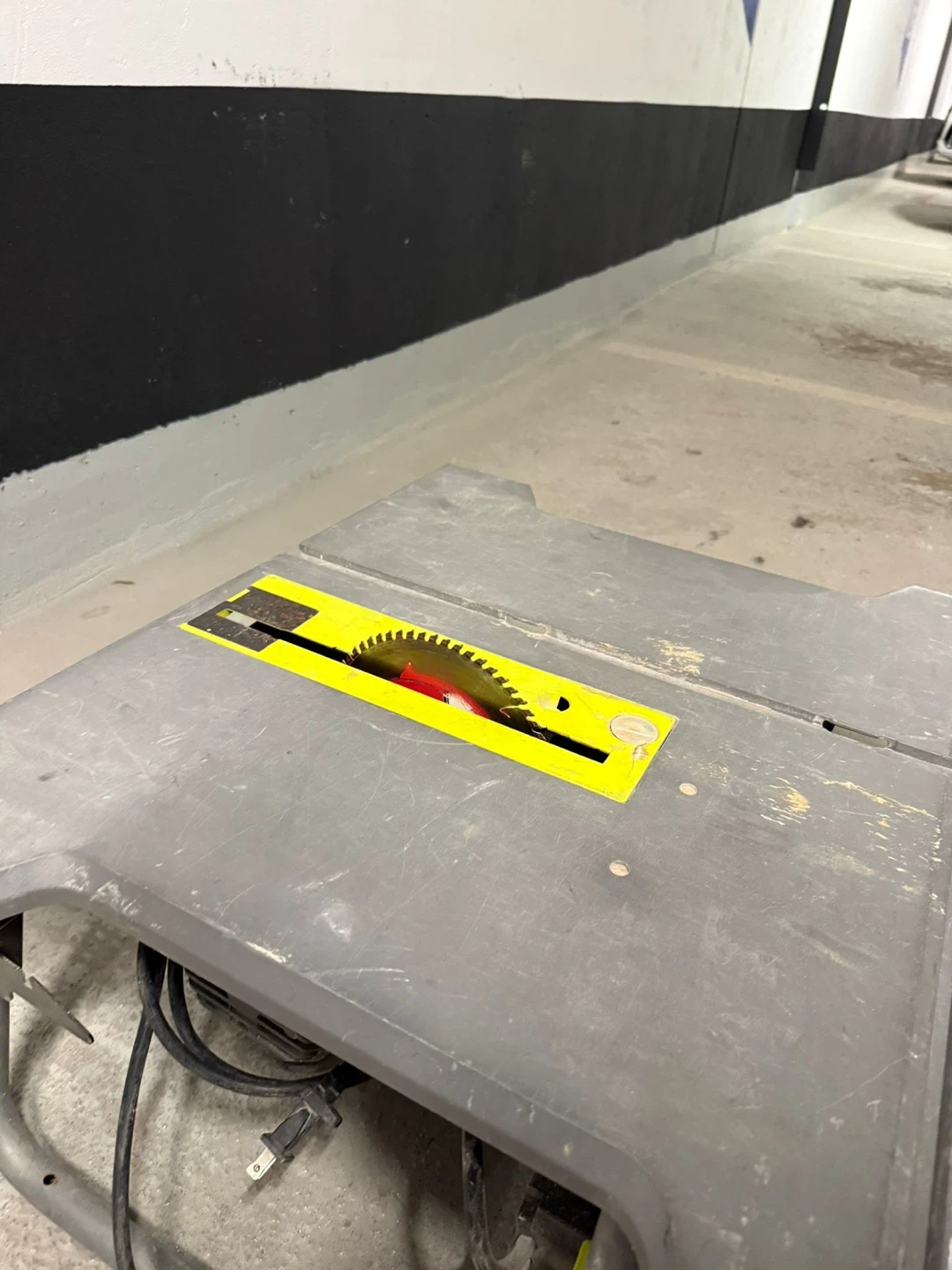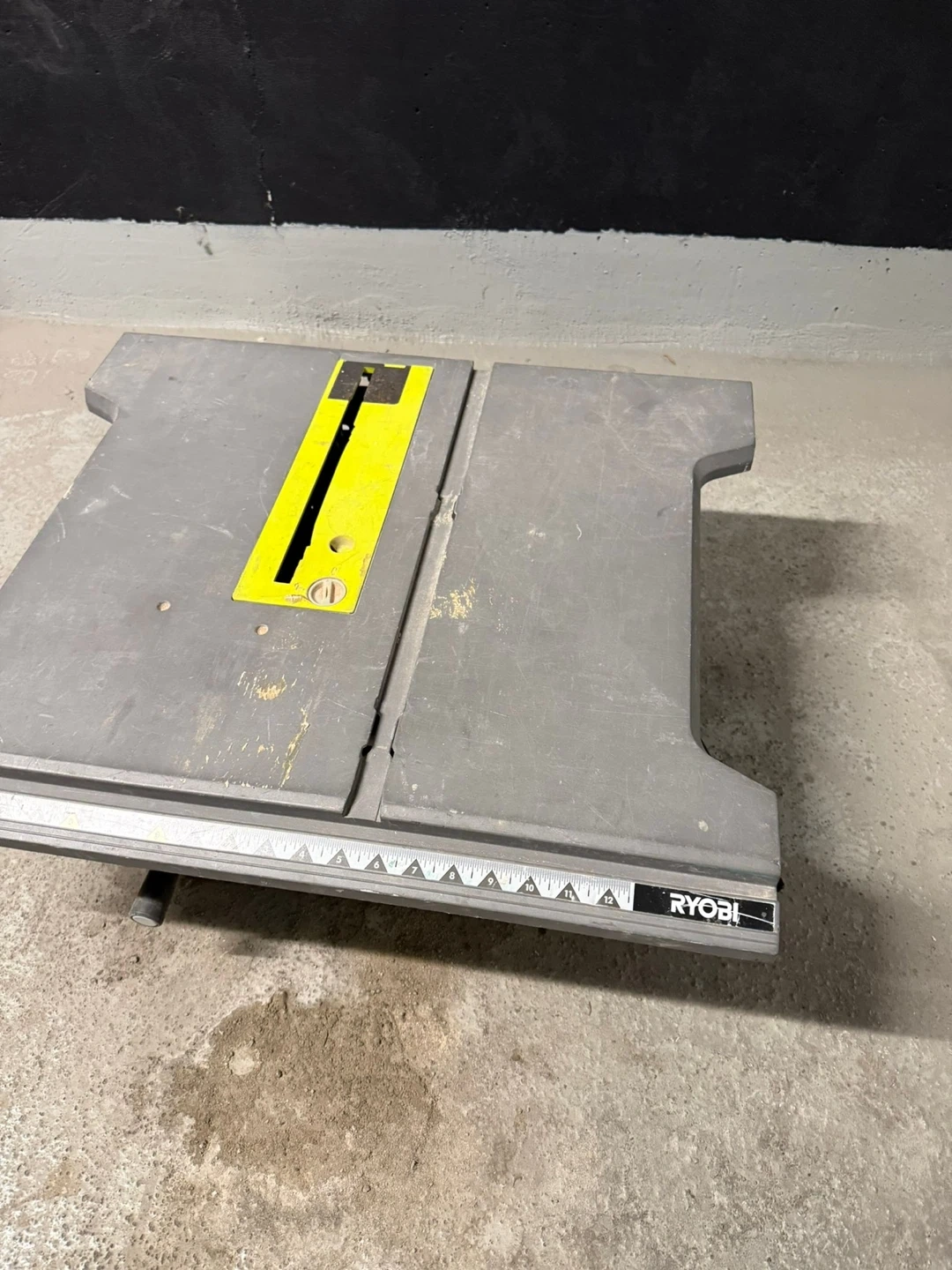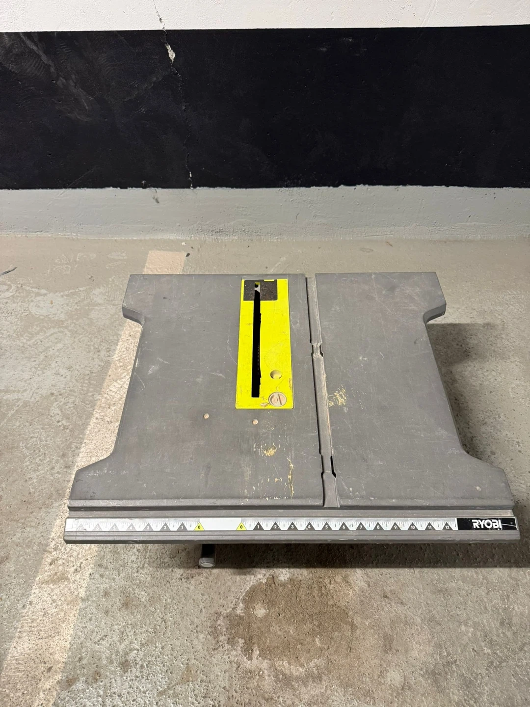 Ryobi table saw with a metal base. It's a compact unit for various cutting tasks. Blade is included. Didn’t use it much, selling it as no longer working in construction