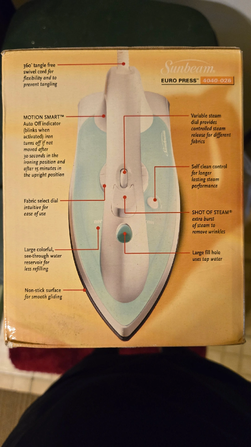 Selling a Sunbeam Euro Press iron, model 4040-026. It features a 360° tangle-free swivel cord for flexibility and to prevent tangling. The Motion Smart auto-off indicator blinks when activated and turns off if not moved after a few seconds in the ironing position and after 15 minutes in the upright position. The fabric select dial is intuitive for ease of use, and it has a large colorful, see-through water reservoir for less refilling. Also features a non-stick surface for smooth gliding, a variable steam dial, self-clean control, and shot of steam for extra burst of steam to remove wrinkles. Large fill hole uses tap water. Box is included