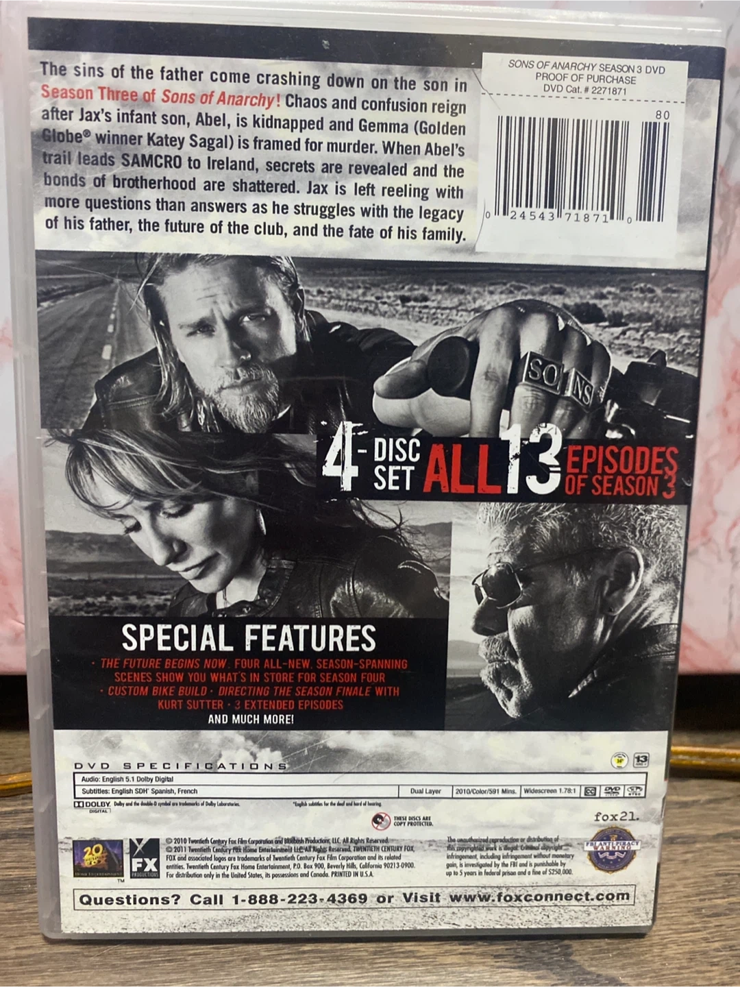 Selling Sons of Anarchy Season Three on DVD! This set includes 4 discs with all 13 episodes of Season 3. Enjoy the special features like extended episodes and more!