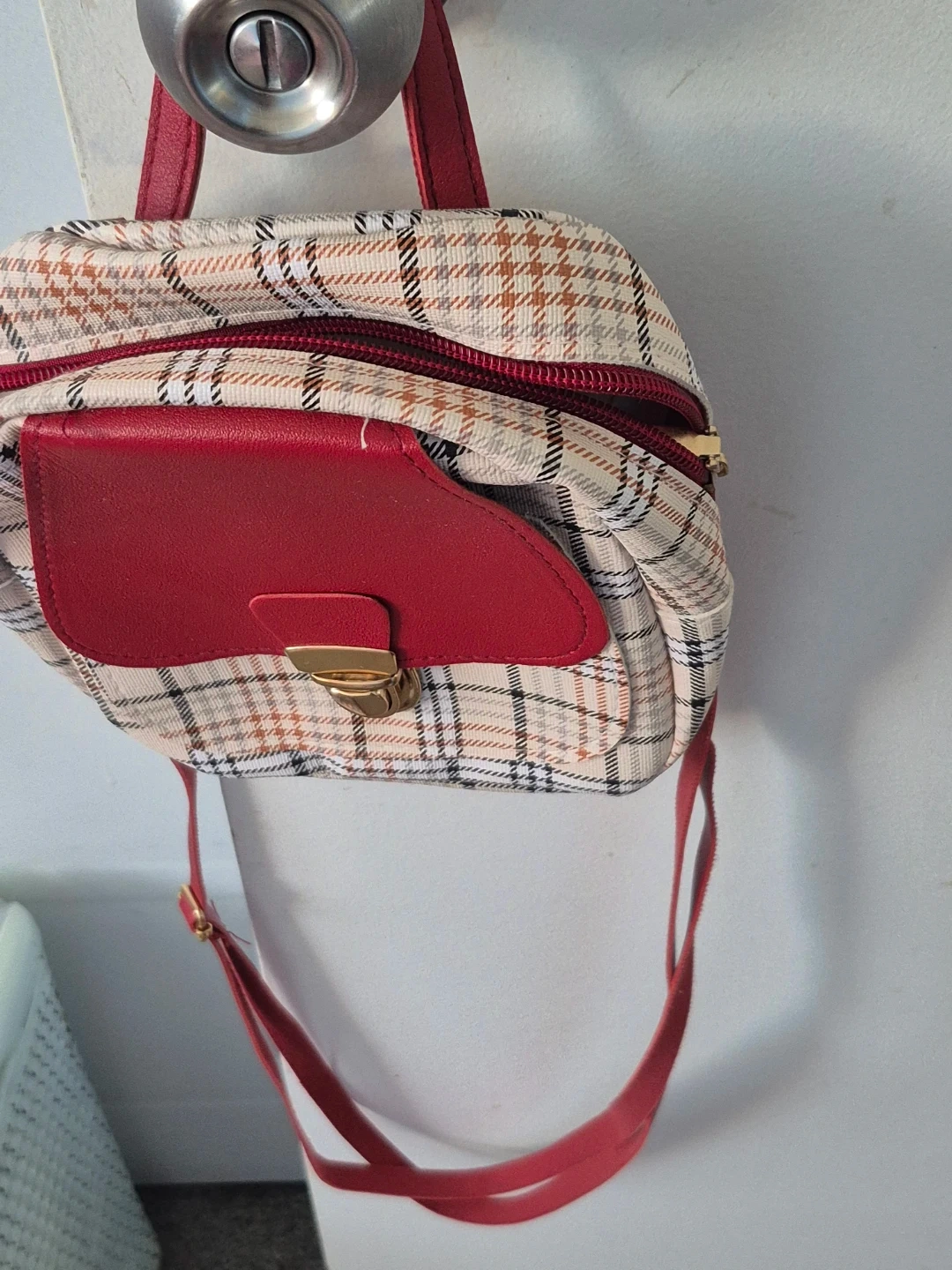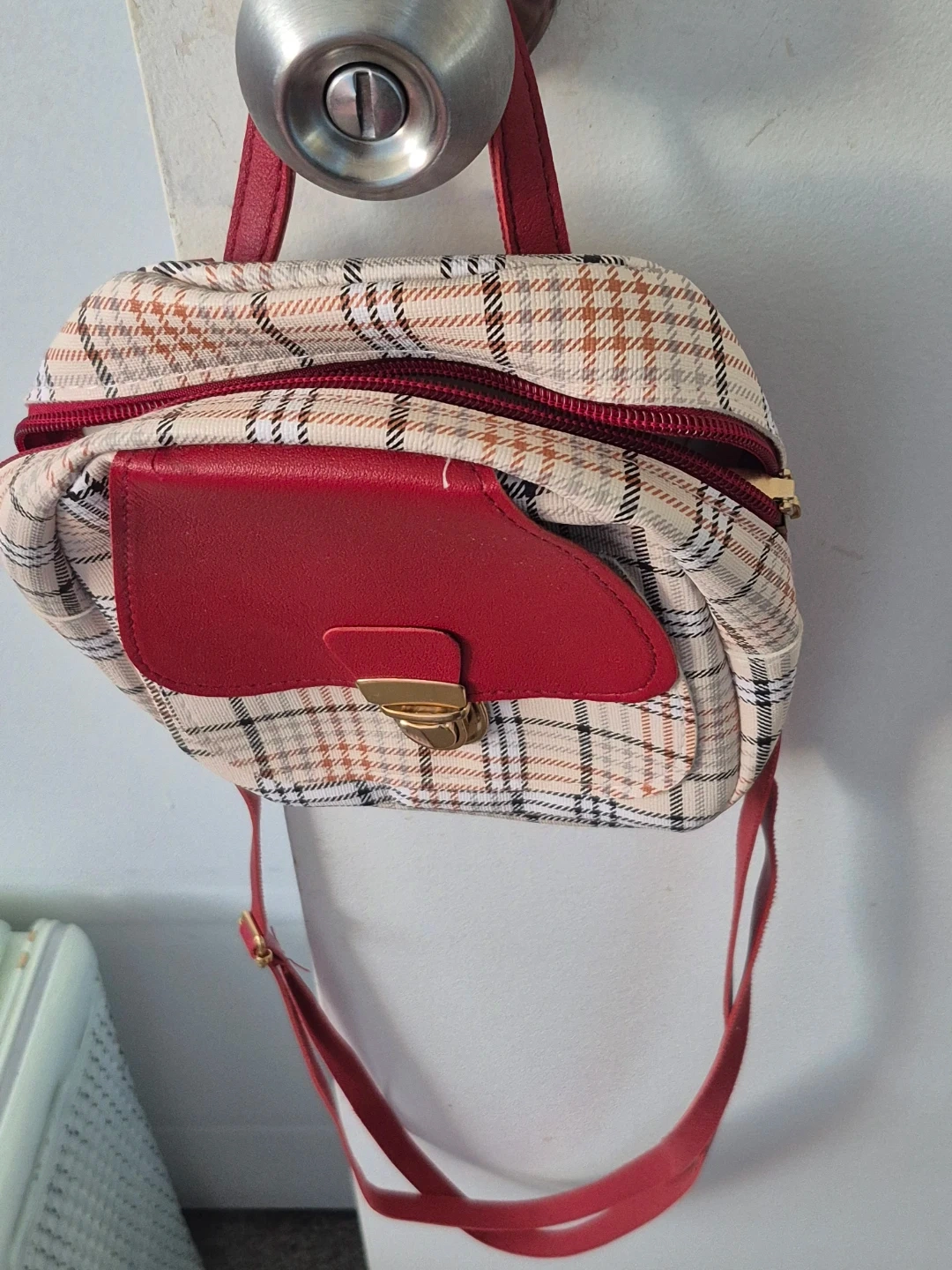 This plaid backpack features a red faux-leather flap with a gold clasp closure. It has a zippered main compartment and an adjustable shoulder strap. The classic plaid pattern offers a stylish look.