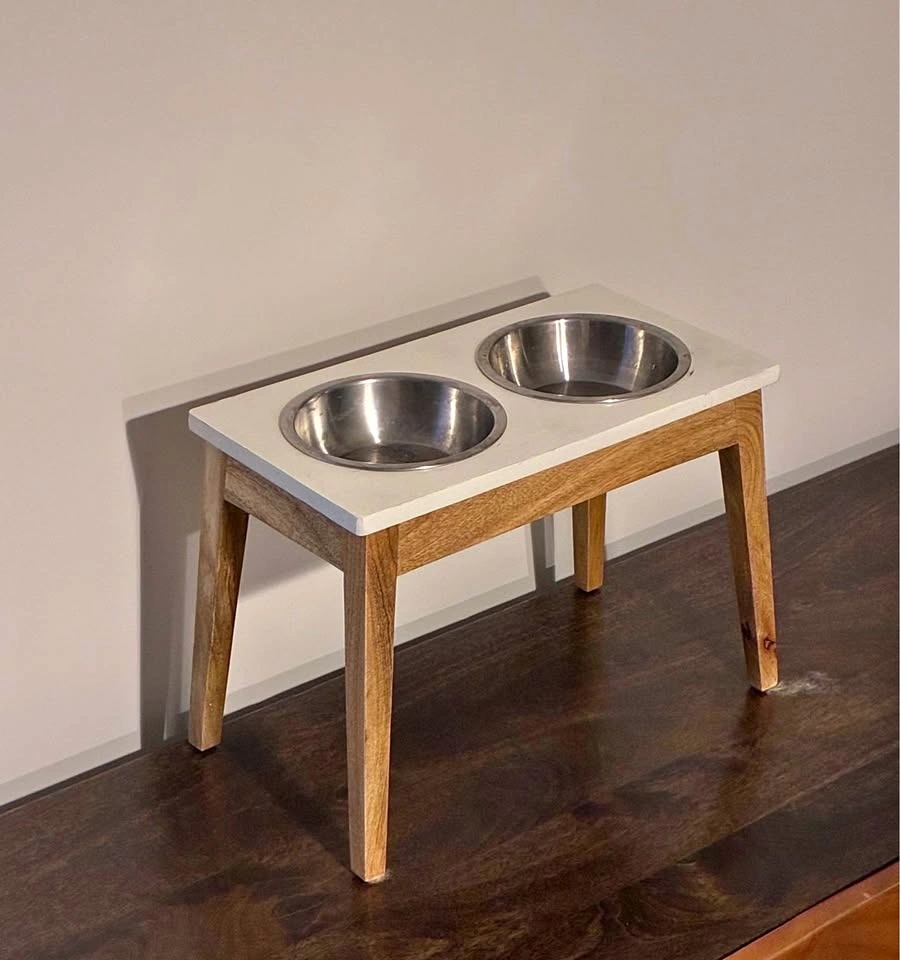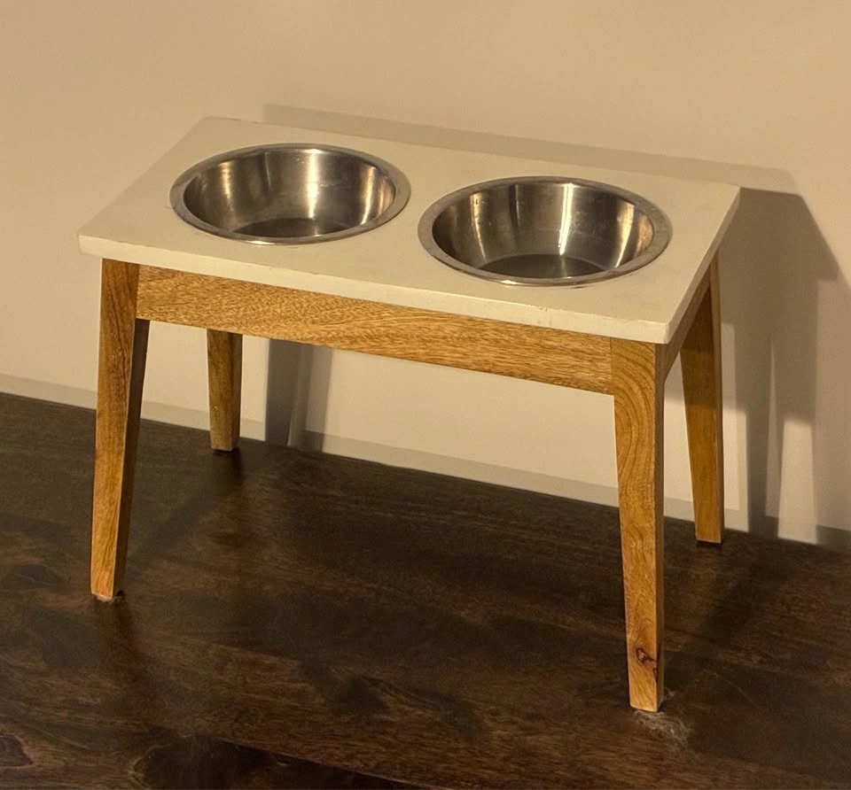 Stylish raised pet feeder with two removable stainless steel bowls. Features a white top and sturdy wooden legs. Great for dogs or cats.