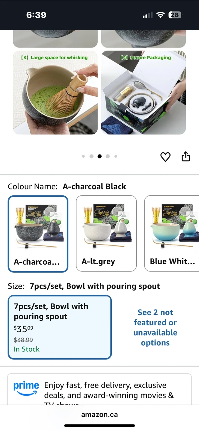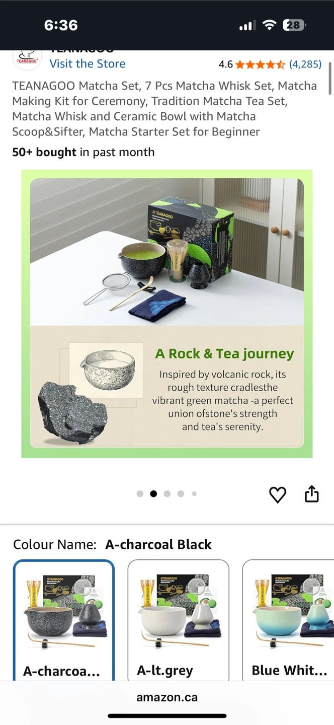 This is a 7-piece matcha set in charcoal black. It includes a whisk, scoop, sifter, bowl with pouring spout, and a tea set. It's for preparing matcha tea.