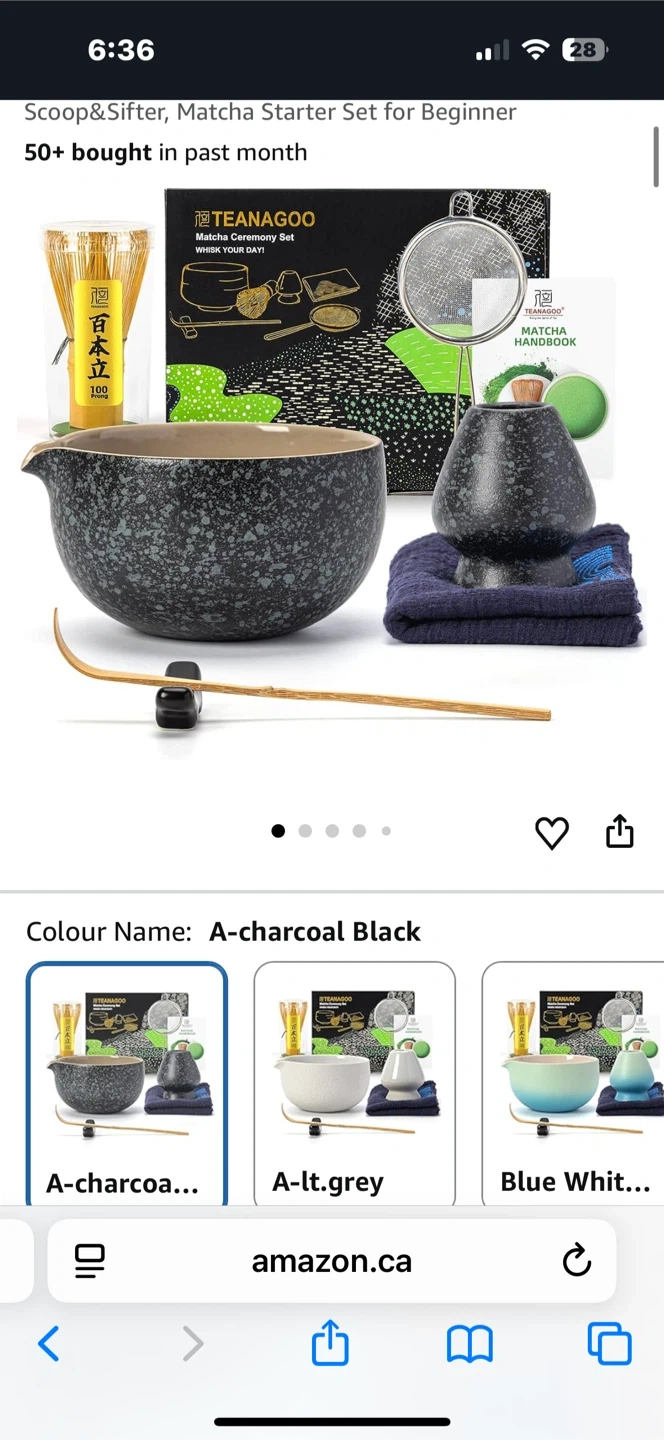 This is a 7-piece matcha set in charcoal black. It includes a whisk, scoop, sifter, bowl with pouring spout, and a tea set. It's for preparing matcha tea.