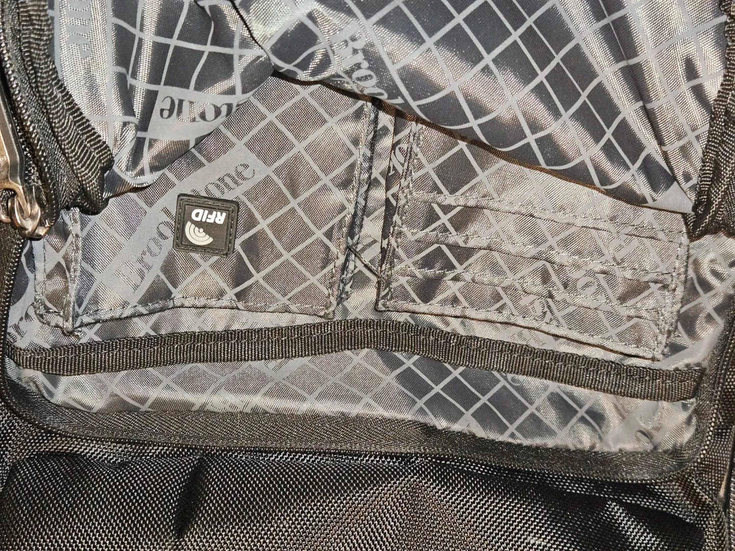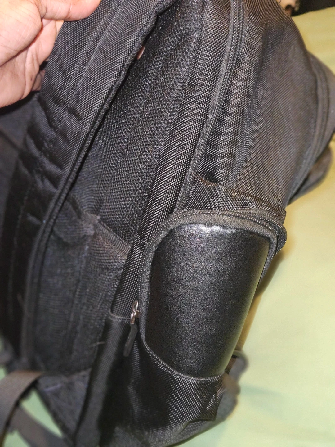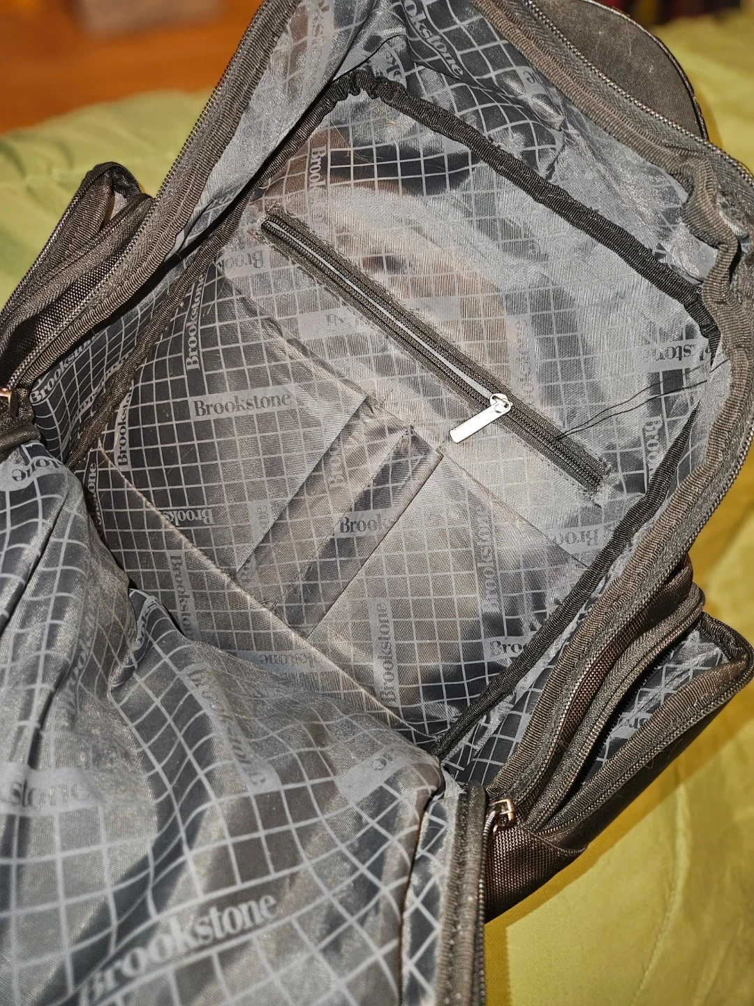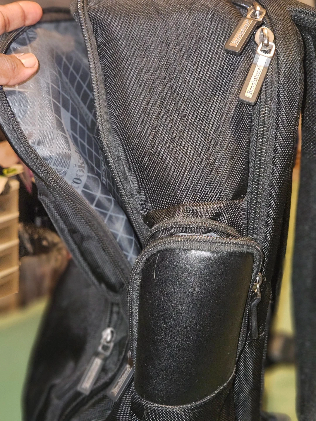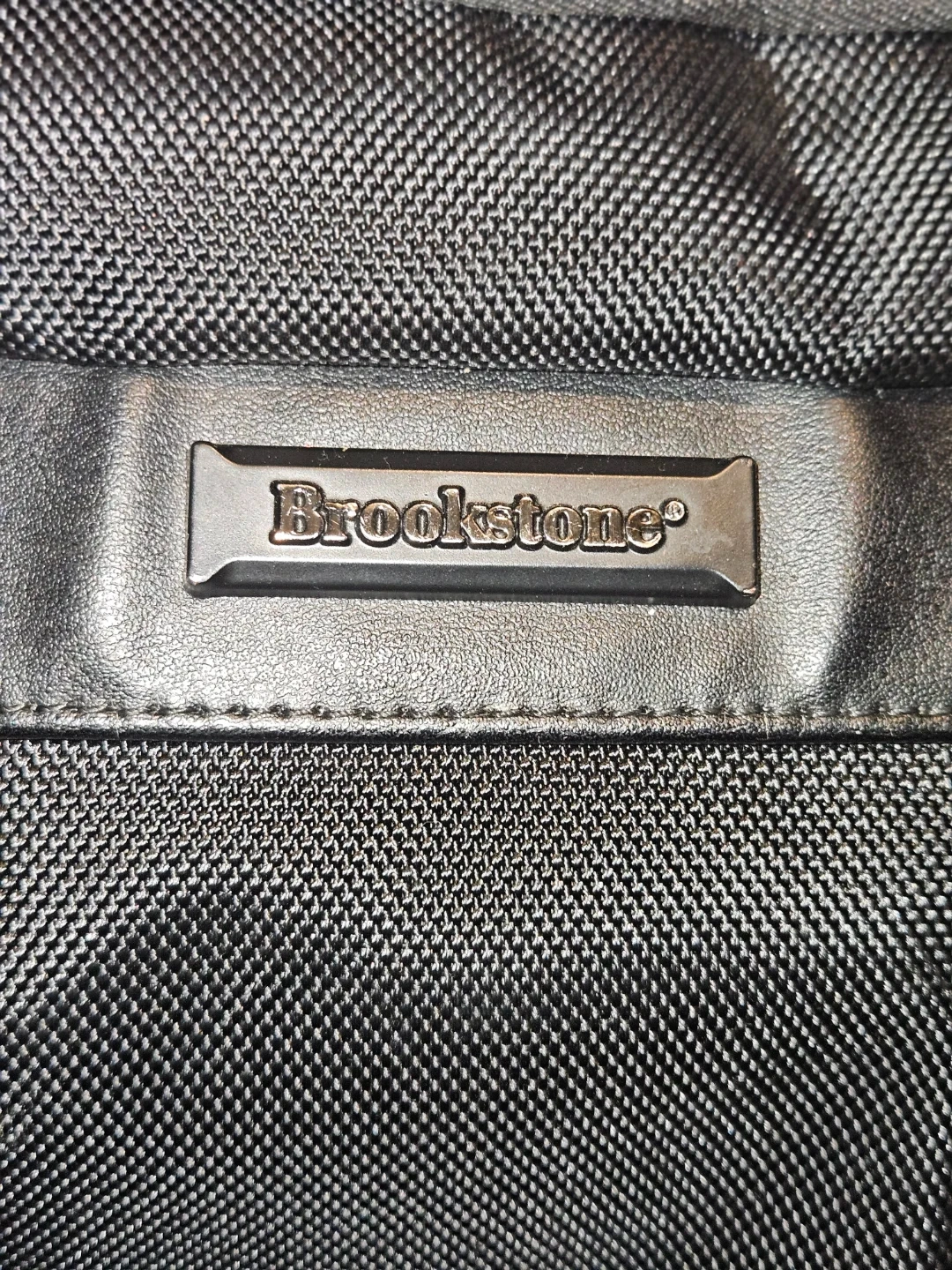 Brookstone Bryce black backpack. Made with durable woven fabric and leather accents. Multiple compartments and pockets for organization. Zippers are in good working order. Has a tear by the zipper can be hand sown or take to dry cleaner. Cost is subtracted from price listed.