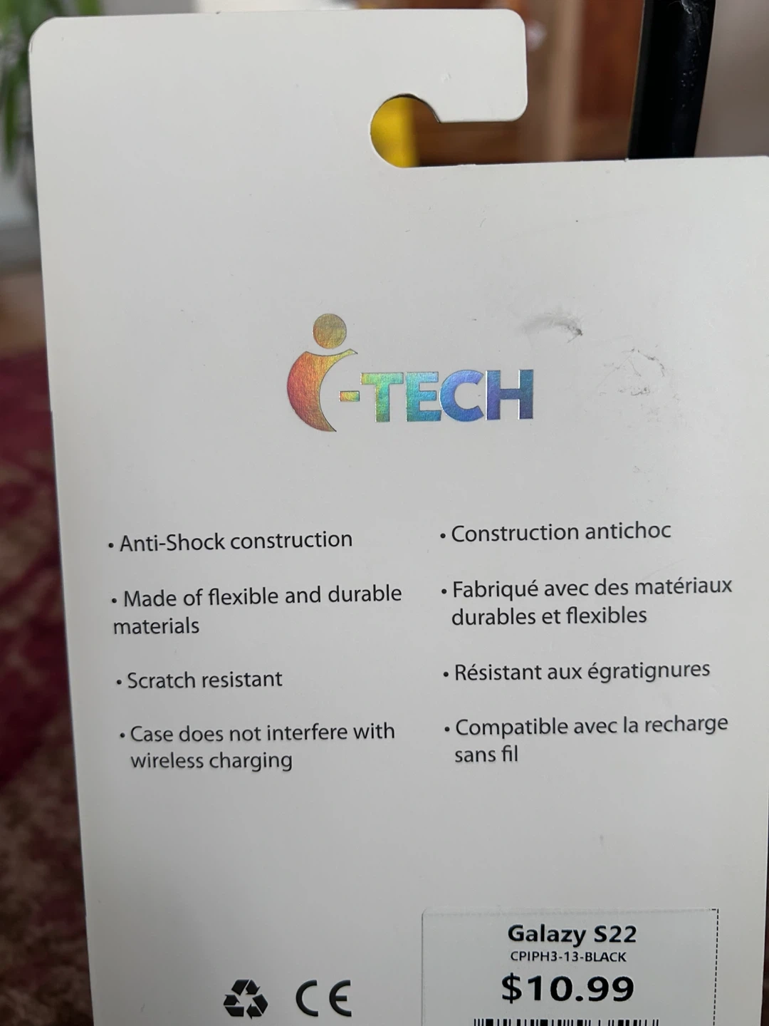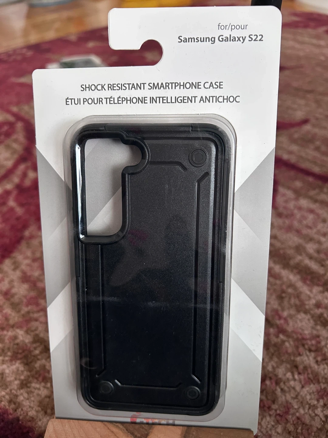 This is a black, shock-resistant smartphone case for the Samsung Galaxy S22. It's made from flexible and durable materials and is scratch resistant. The case doesn't interfere with wireless charging.
