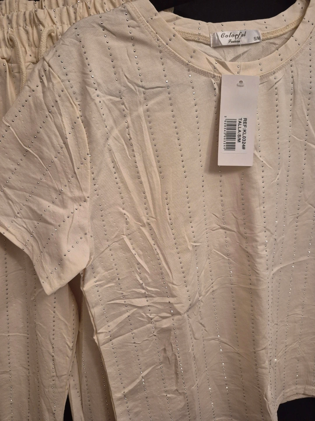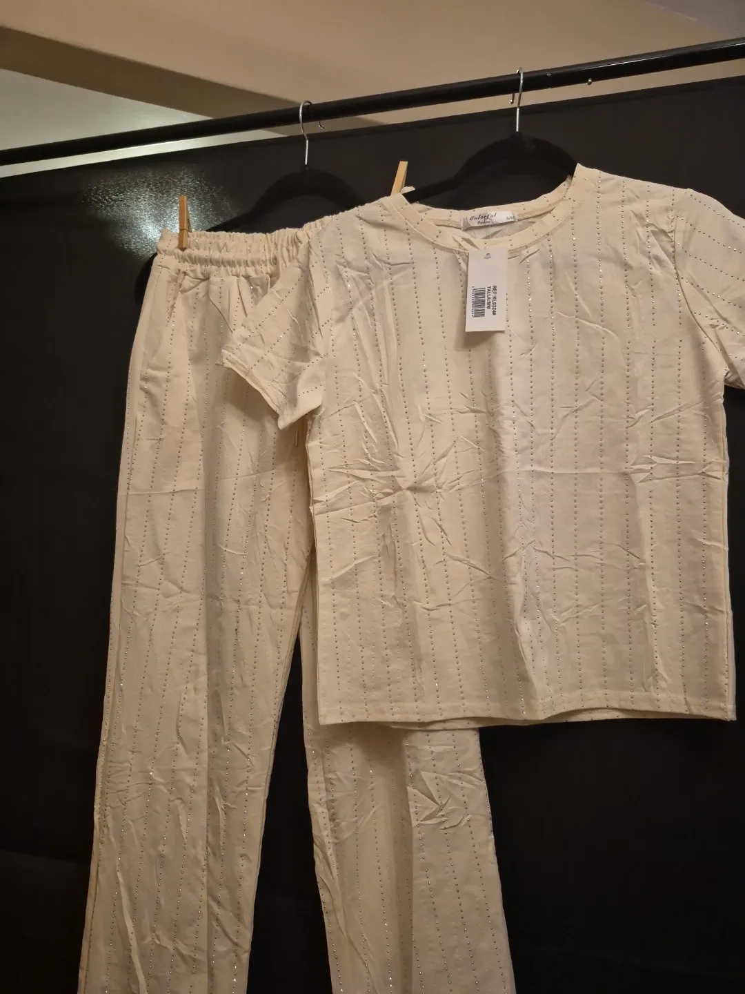 Cream coloured two-piece set featuring a short-sleeved top and matching pants. The outfit is adorned with sparkling vertical stripes. Both pieces are labelled S/M.