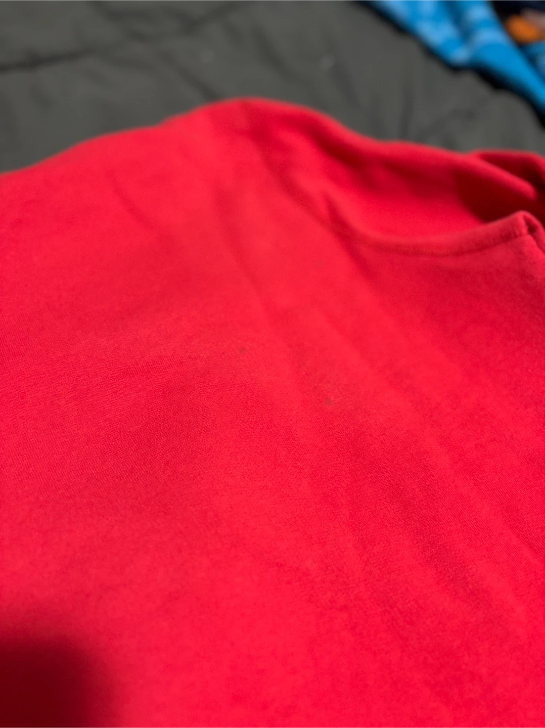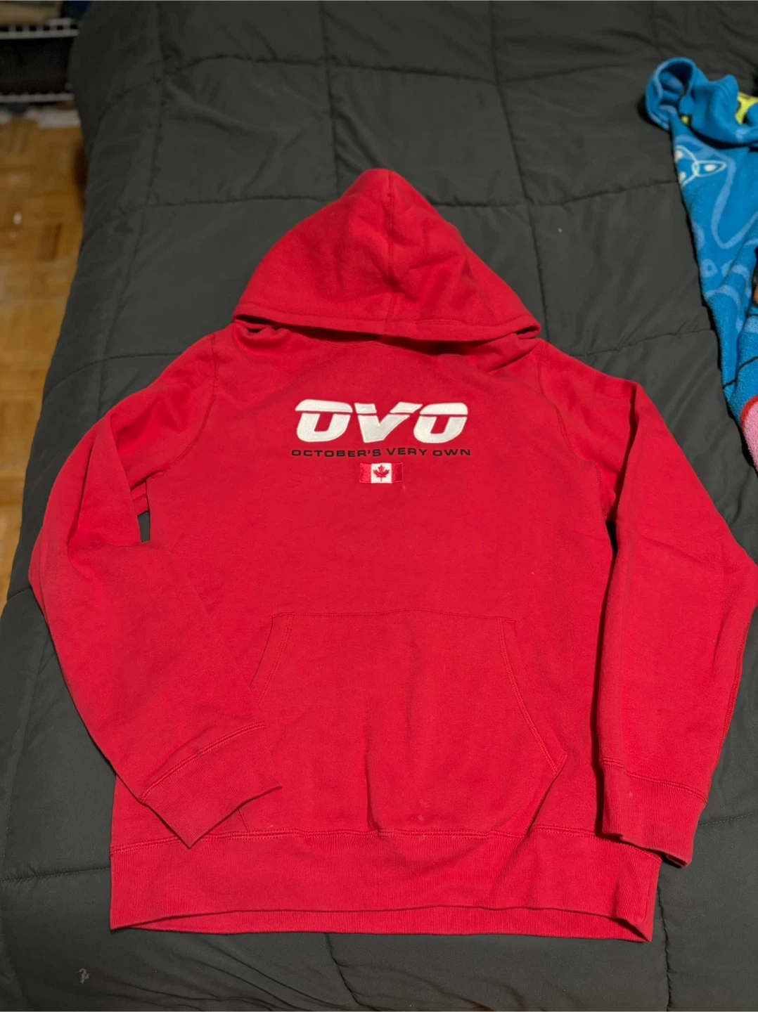 Red OVO October's Very Own hoodie. Size is large. Made in Canada. There are a few small, light marks on the front. Shown in pics and some on back