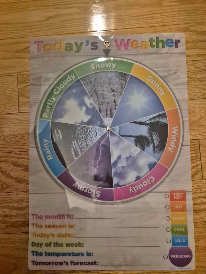 15Like new. Turn the wheel to match the weather & fill in the daily information/ forecast. Heavy duty washable chart. Use with dry erase markers. Thickson and Taunton. Pet and smoke free home. No holds. Fastest pickup. #homeschool #classroom #preschool