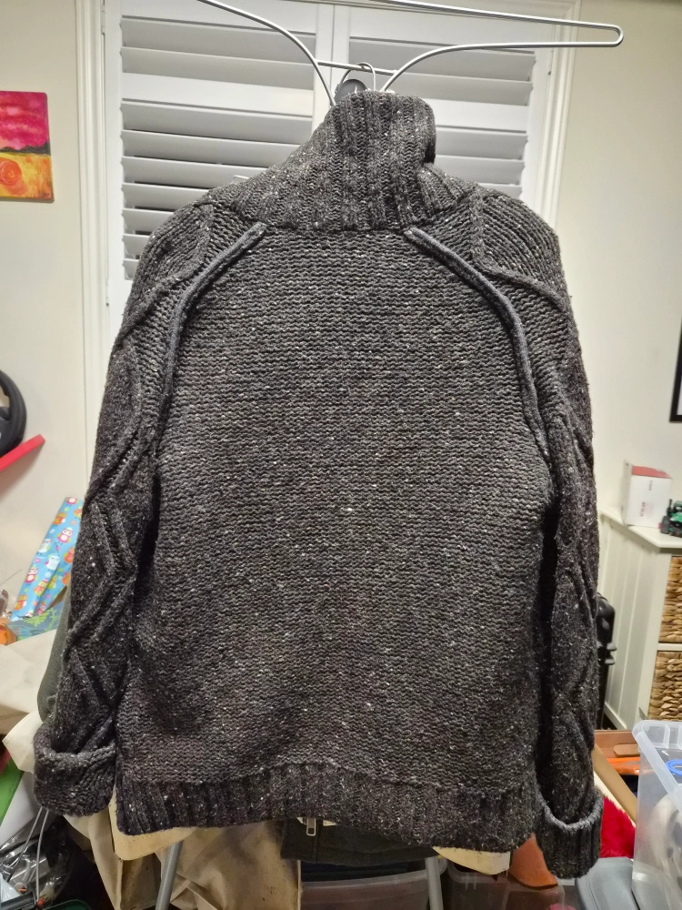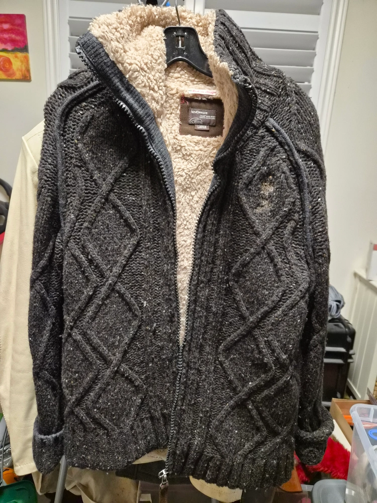 53Cozy up in this Weatherproof Vintage cardigan! It's a men's size large and features a stylish knit pattern with a warm, sherpa-like lining. Perfect for chilly Canadian evenings!