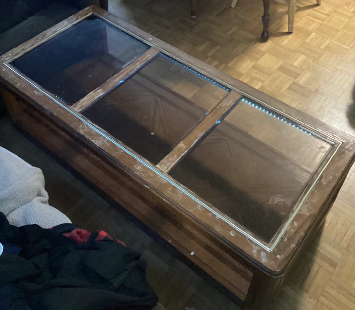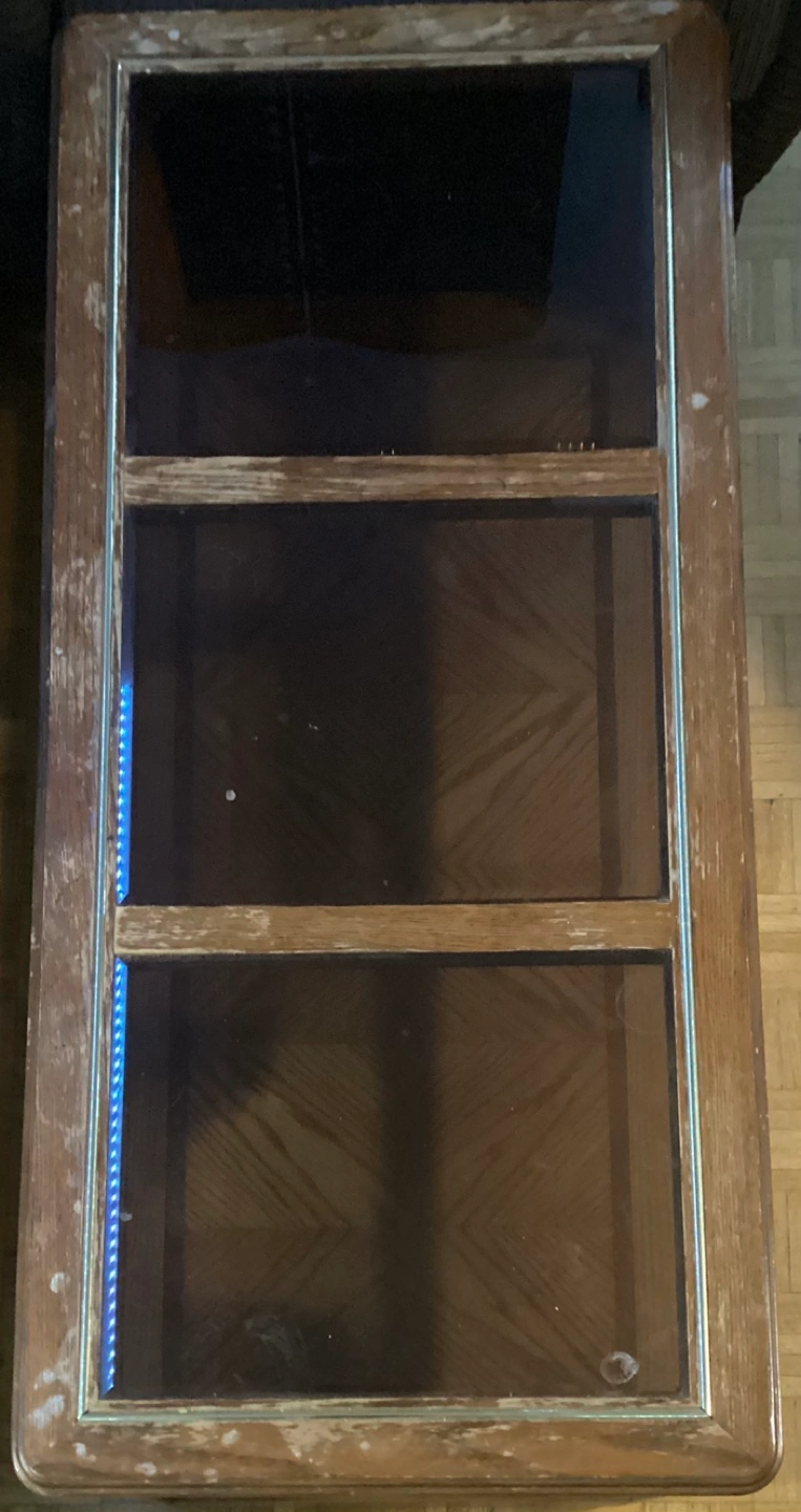 Unique coffee table, wooden frame, glass top. Three sections separated by wood. Minor discolorations.
