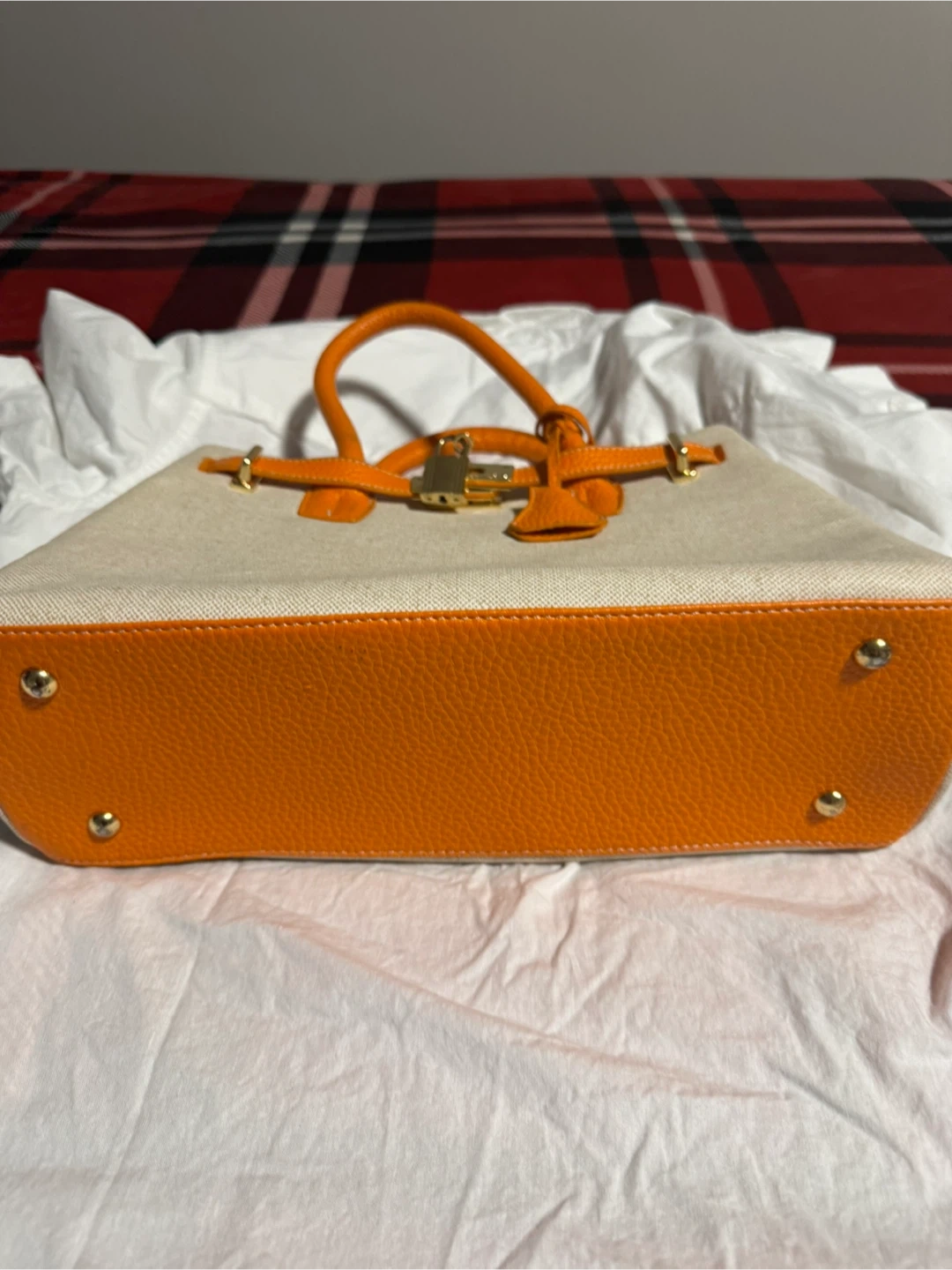 This satchel handbag features a cream canvas body with orange leather trim and handles. It has gold-tone hardware and a turn-lock closure. Bag's bottom has protective metal studs.