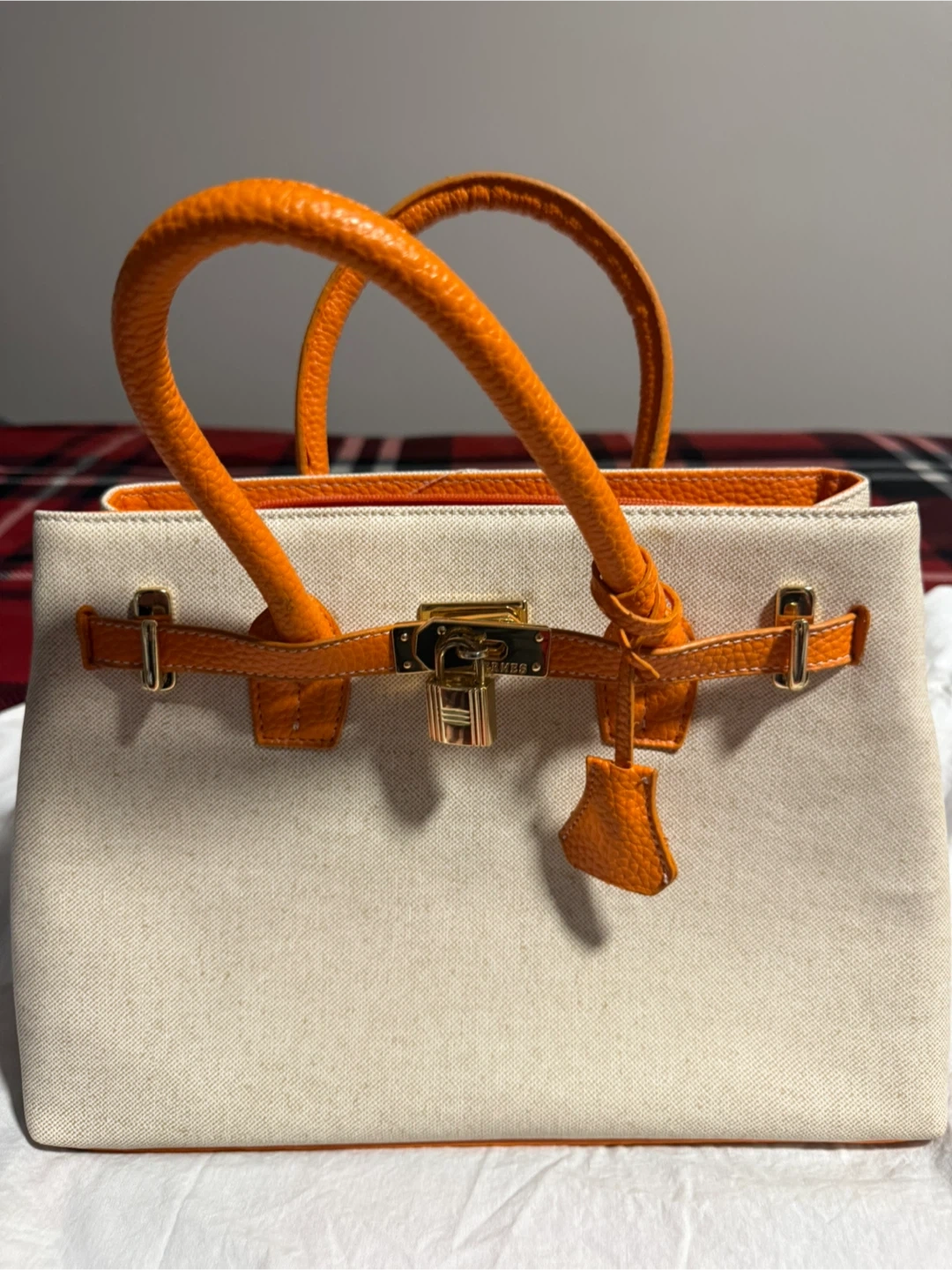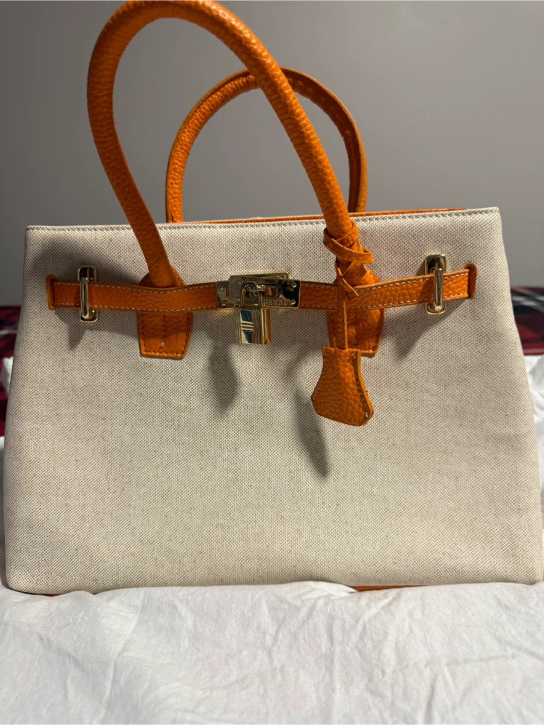 This satchel handbag features a cream canvas body with orange leather trim and handles. It has gold-tone hardware and a turn-lock closure. Bag's bottom has protective metal studs.