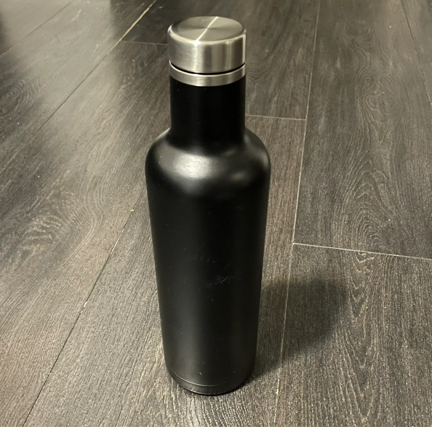 A matte black reusable water bottle with a silver metal lid. It's great for keeping your drinks cold or hot. This durable bottle is perfect for on-the-go hydration.
