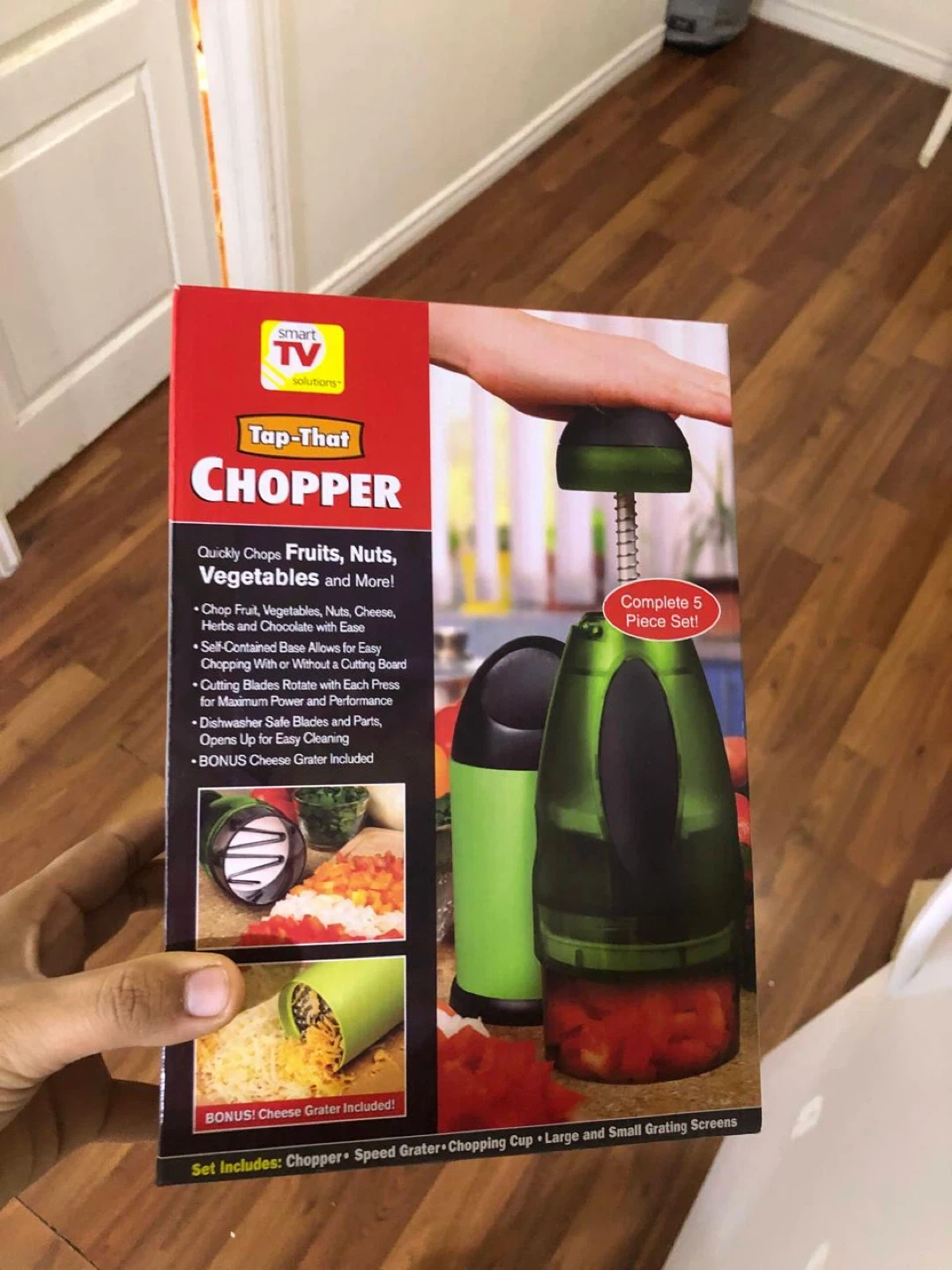 This Tap-That Chopper quickly chops fruits, nuts, vegetables, and more. It's dishwasher safe and includes a bonus cheese grater. The set includes the chopper, speed grater, chopping cup, and large and small grating screens.