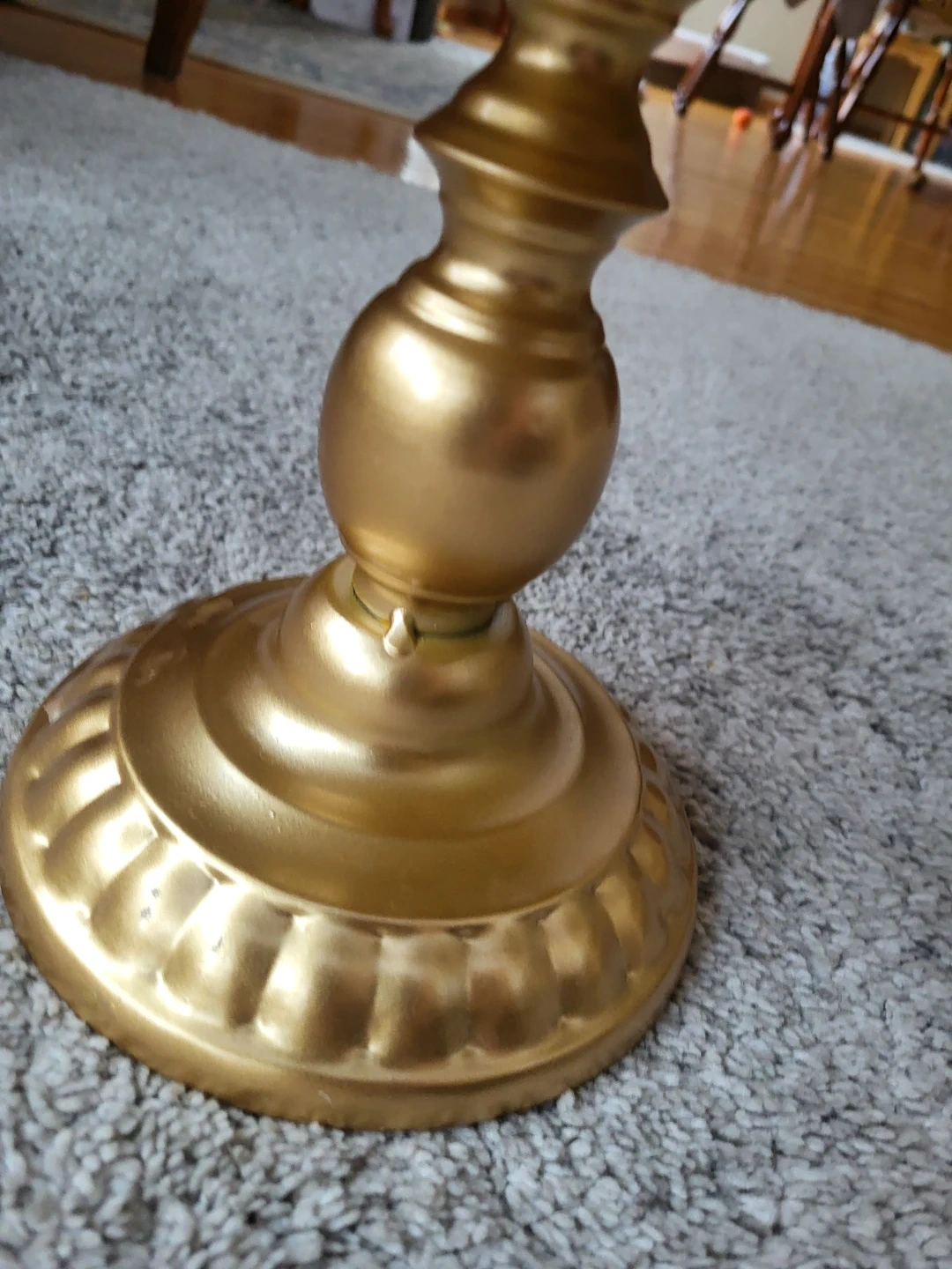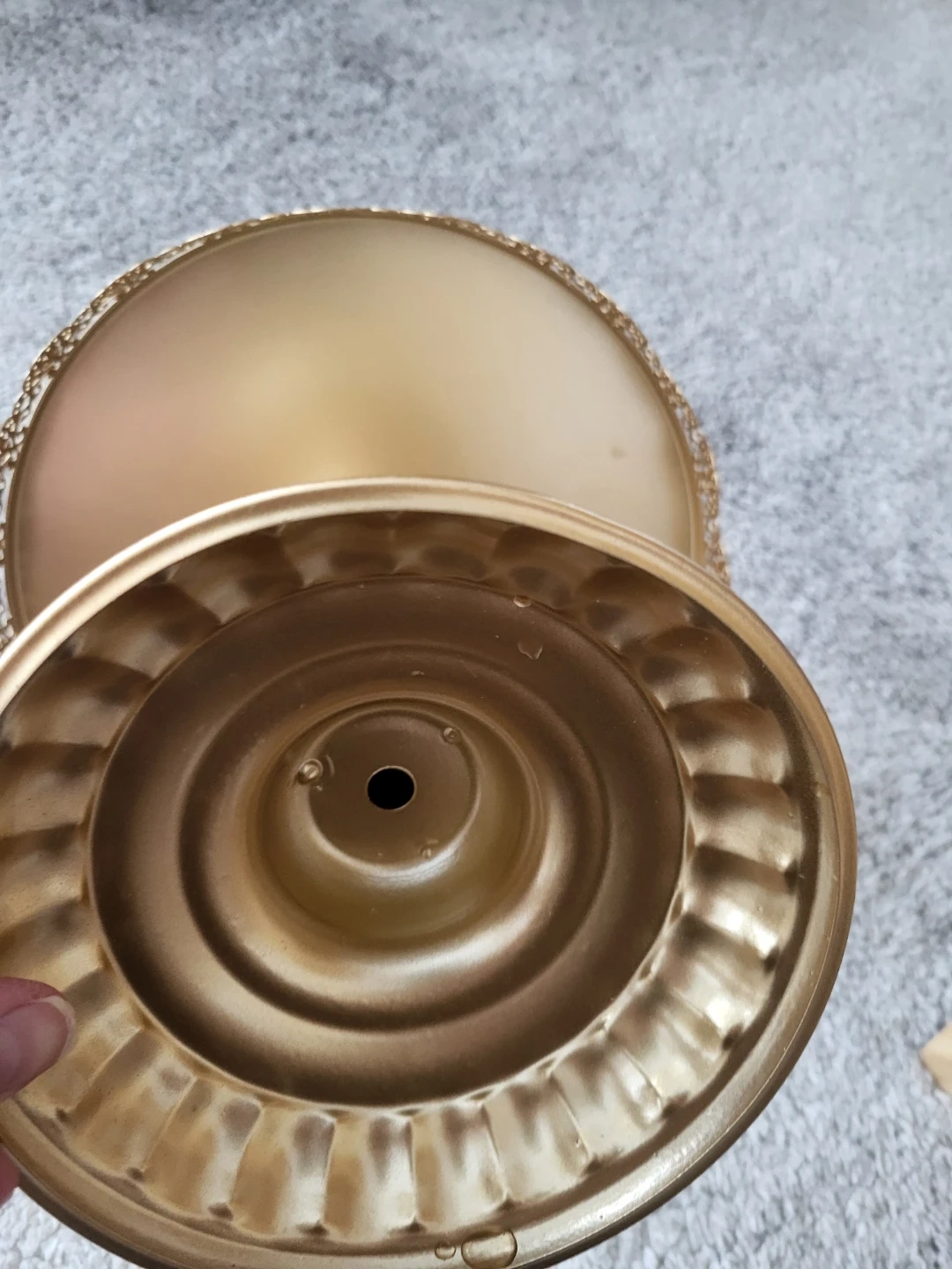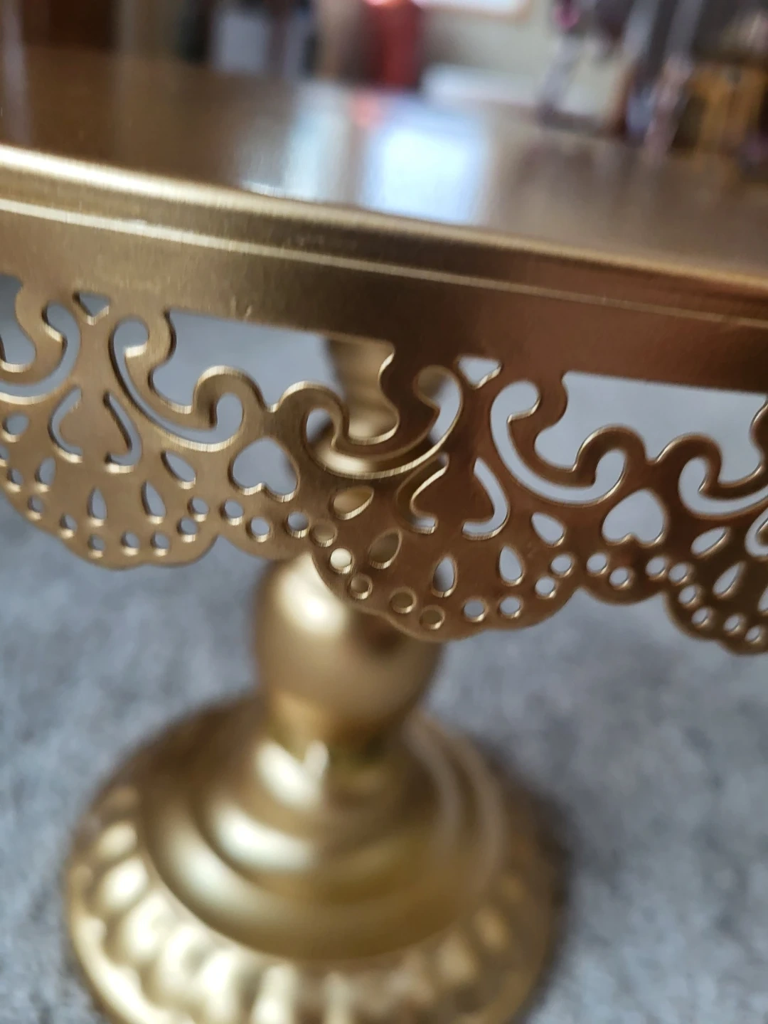A beautiful gold cake stand with decorative filigree edges. It's perfect for displaying cakes and desserts. The base has a patterned design.