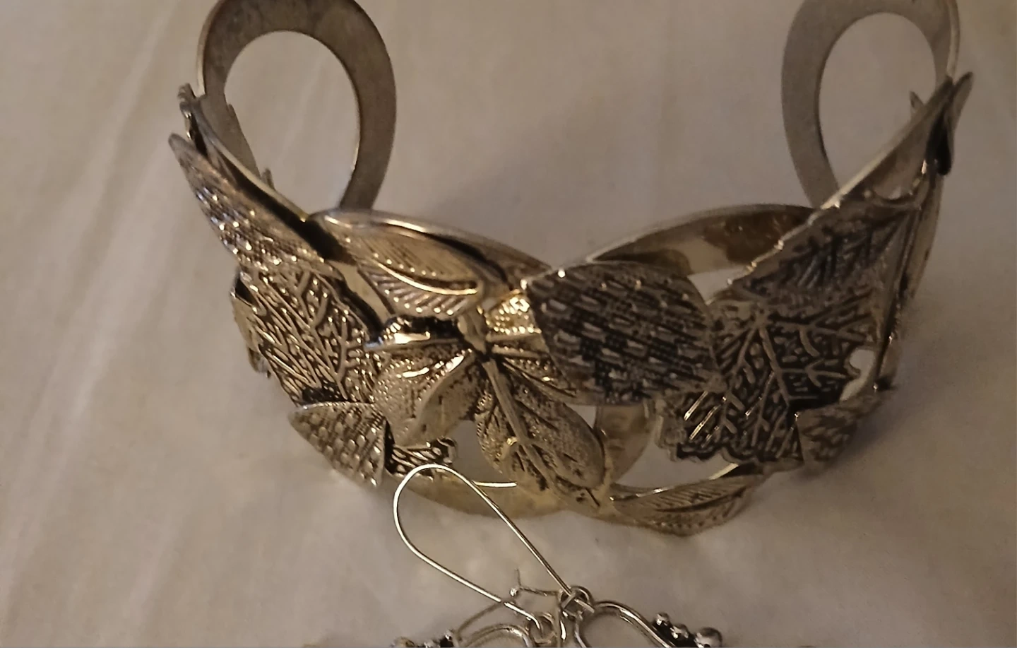 Silver Tone Leaf Design Cuff Bracelet and Fan Earrings Set