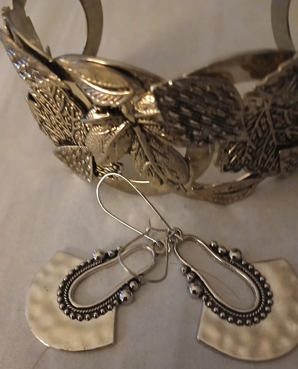This set includes a cuff bracelet with a detailed leaf design and a pair of fan-shaped dangle earrings. Both pieces have a silver tone finish and a textured hammered look on the earring dangles. It's a lovely set for dressing up an outfit!