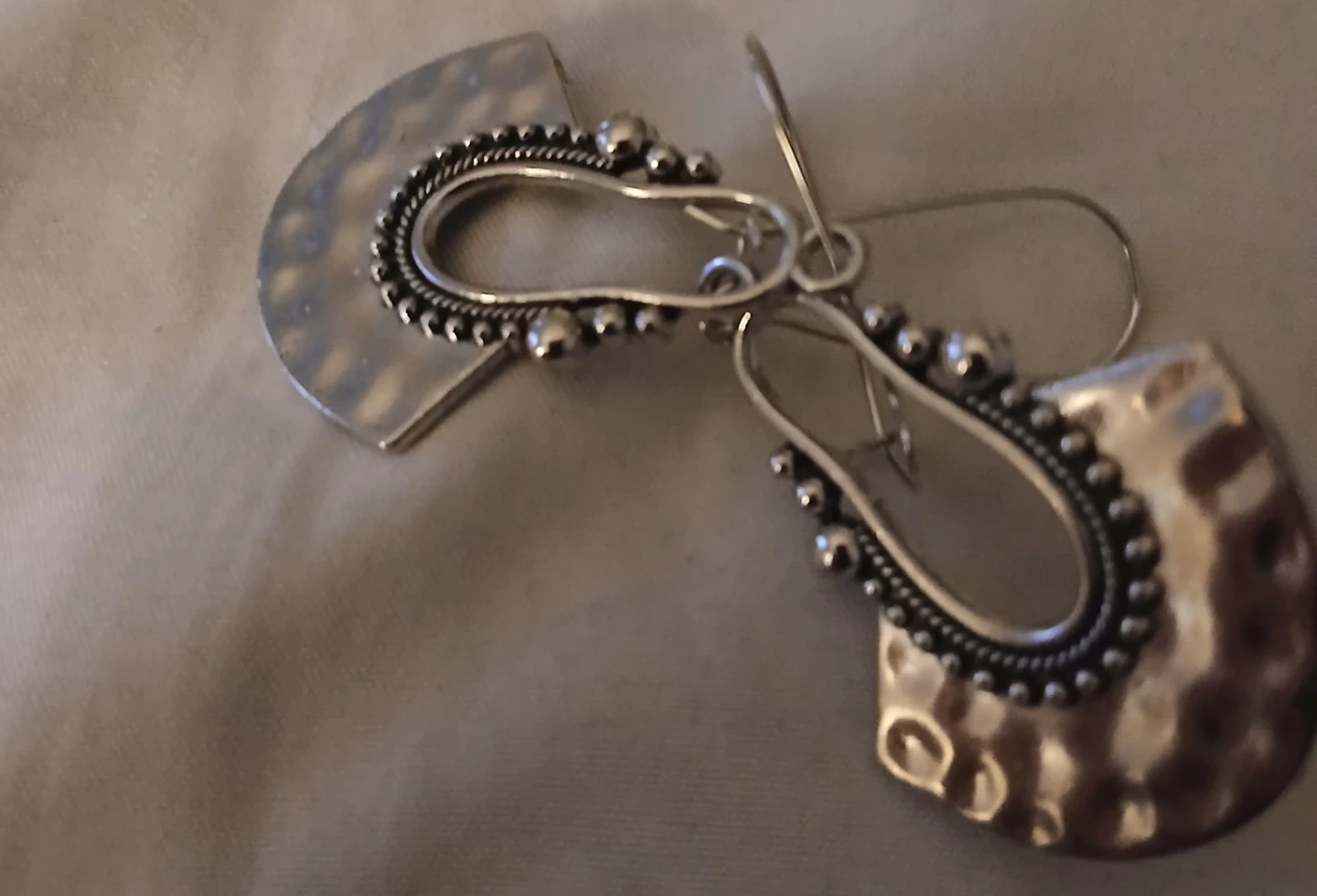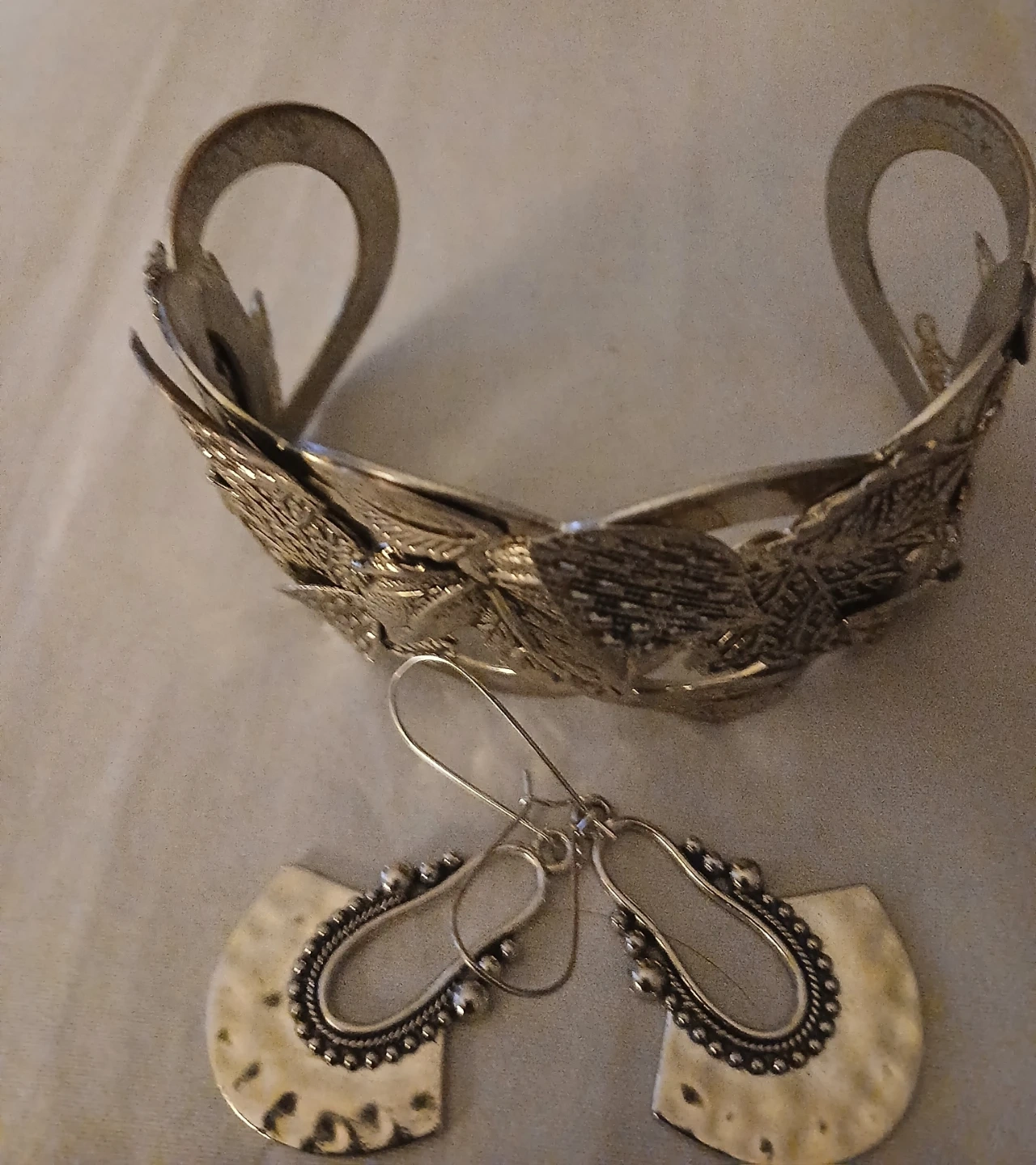 This set includes a cuff bracelet with a detailed leaf design and a pair of fan-shaped dangle earrings. Both pieces have a silver tone finish and a textured hammered look on the earring dangles. It's a lovely set for dressing up an outfit!