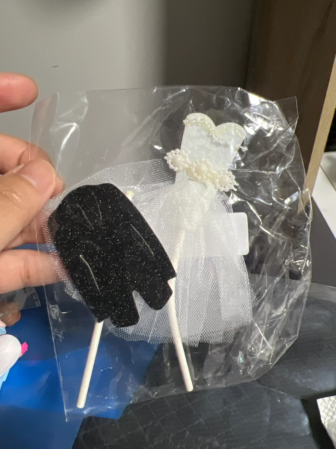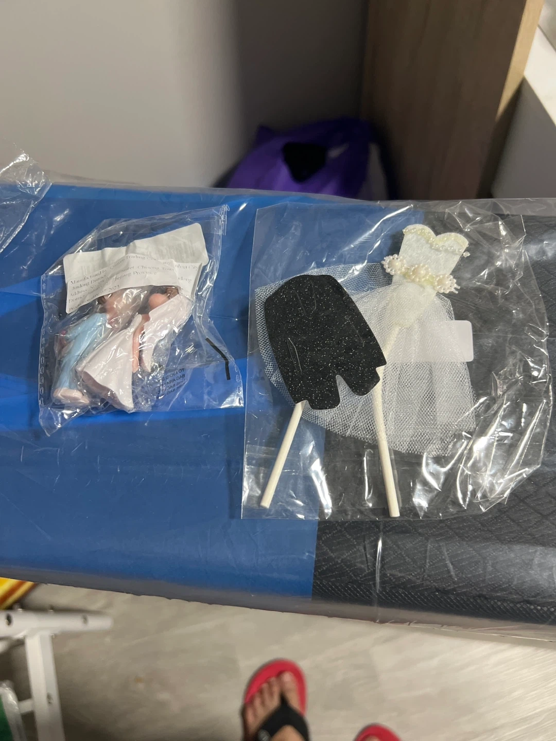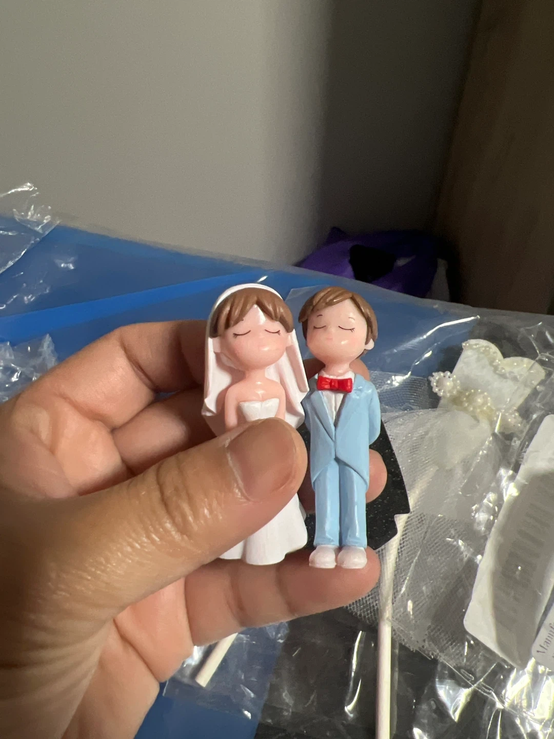 Selling a cute wedding cake topper set! Includes a bride and groom figurine, a miniature wedding dress, and a tuxedo decoration. Perfect for adding a special touch to your wedding cake!
