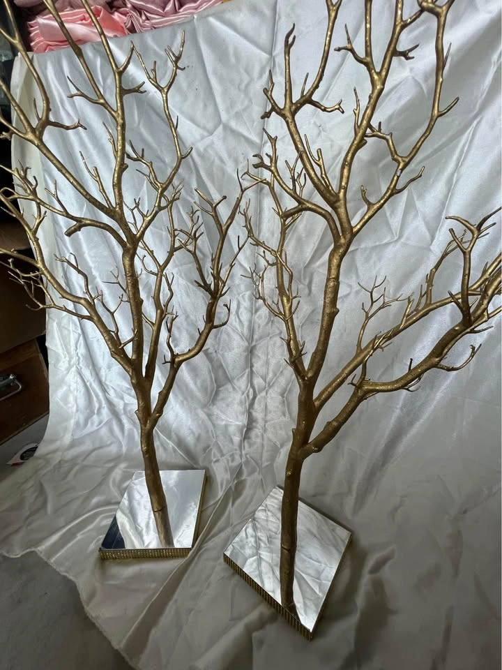 20Various decor items for sale! Pricing as follows- if ad & picture is still up it’s available: 2 Silver Vases $10 for both Hexagon candle holder $2 Triangle candle holder $2 Square wooden sign $3 12 Small candle holders $10 for all Gold tree branches $30for both Tall glass vase $2 each White desert table $200 Large mirror welcome sign $80
