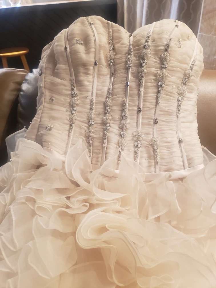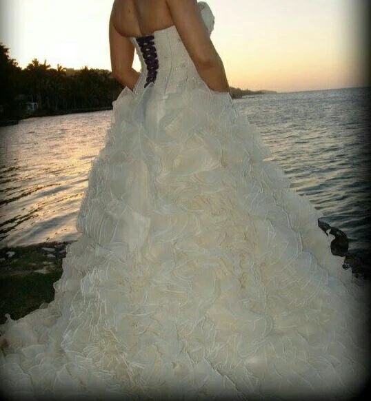 10Amanda Lina off white ruffled wedding gown for sale. Size 8 with corset top. It is professionally cleaned and was worn once.