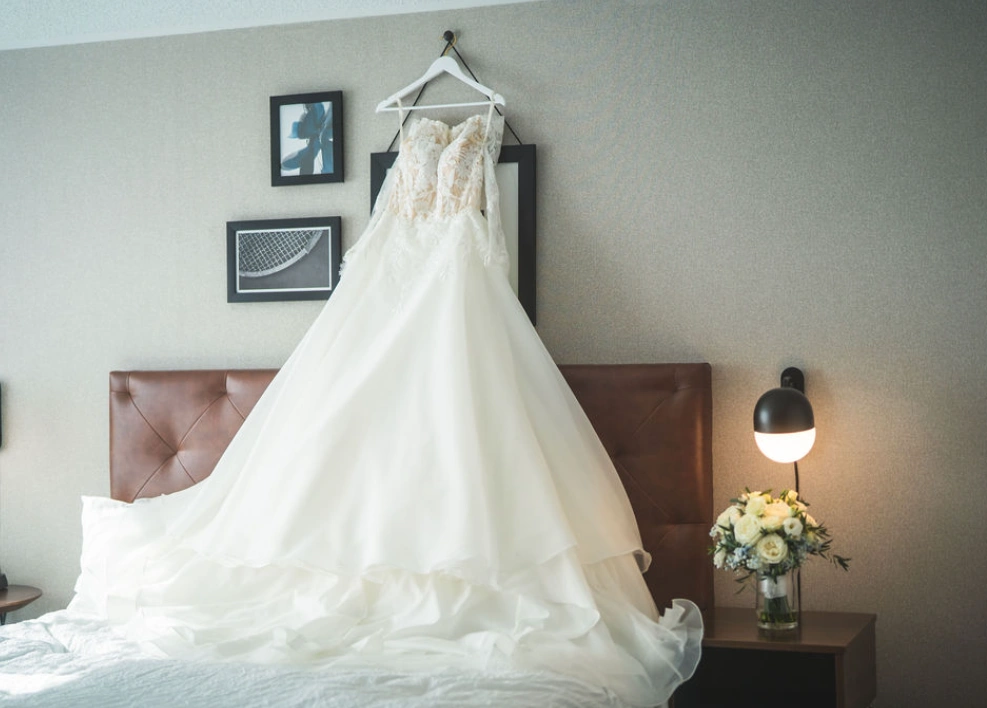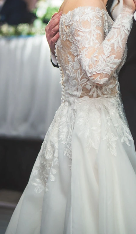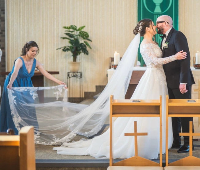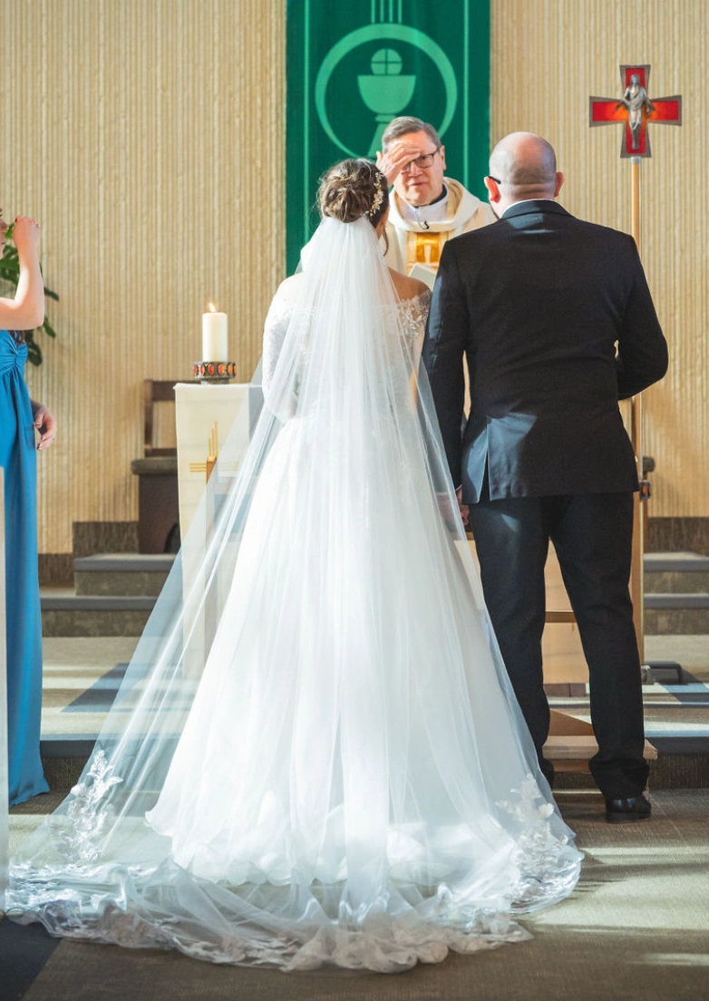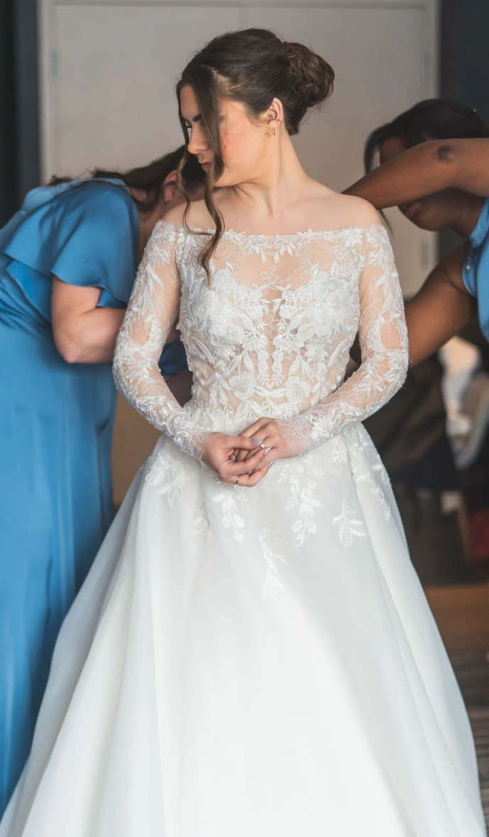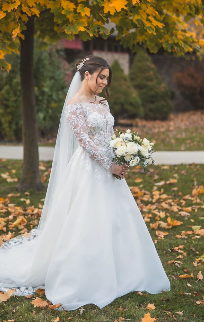 Bought dress and cathedral veil new Worn once in November 2024 S/f home Dress has bustle, so you can 'pin it up' for reception Size small (I am 5'4 and 130 lbs) - feel free to try on $800 OBO