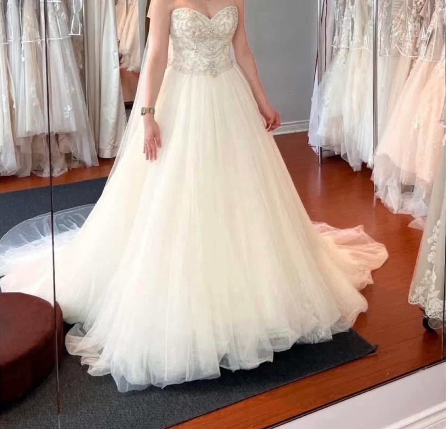 Selling a beautiful wedding dress that's perfect for your special day! It features a lovely strapless design with delicate embellishments on the bodice. The dress has a full, flowing skirt that will make you feel like a princess. It's in great condition and ready to make someone's wedding dreams come true