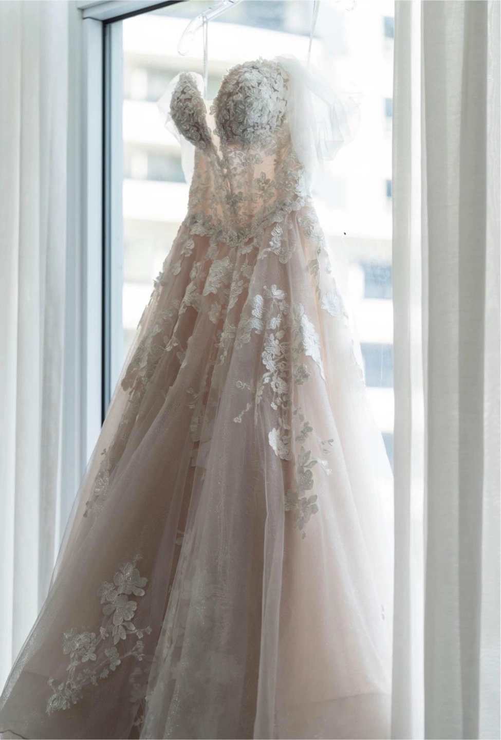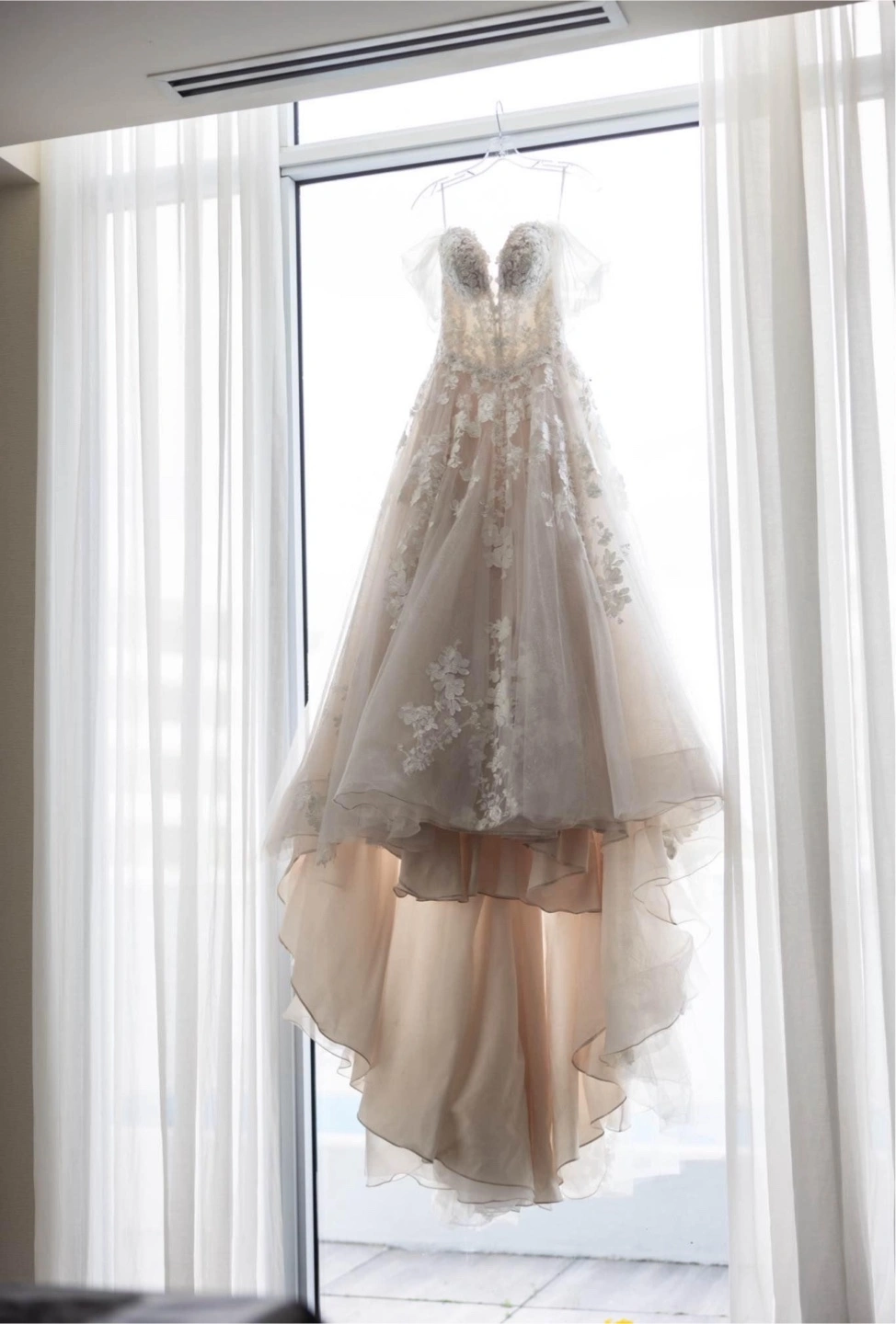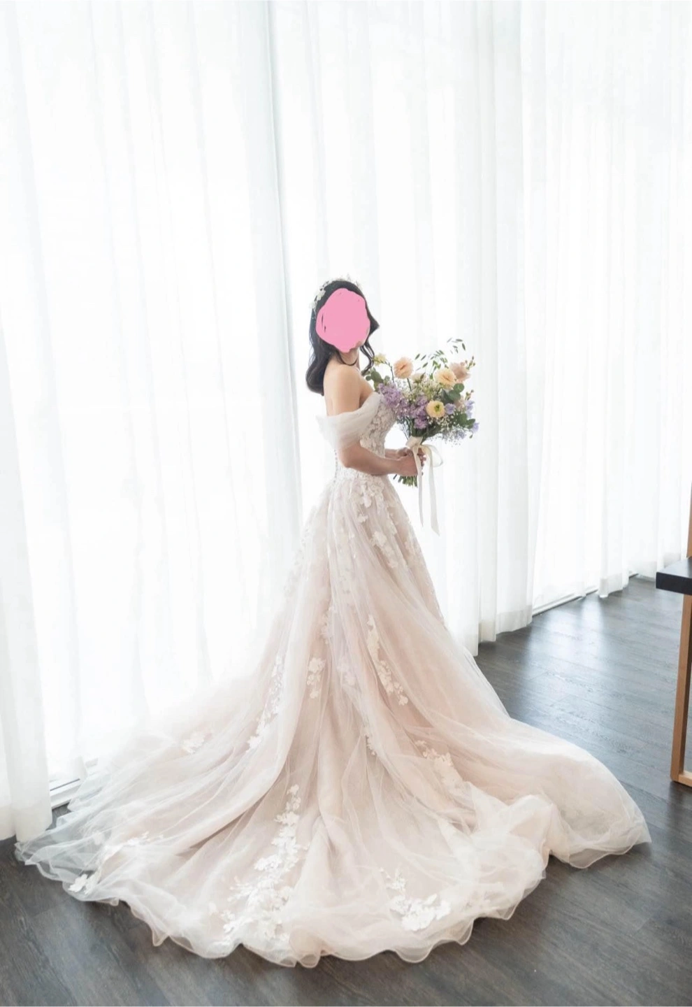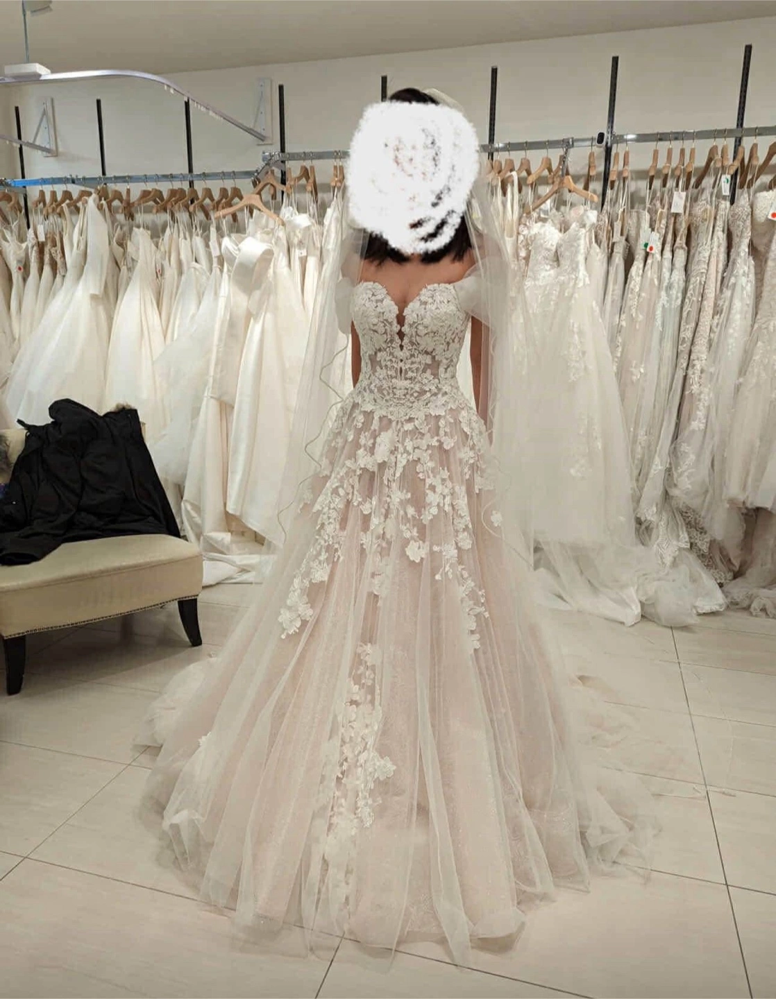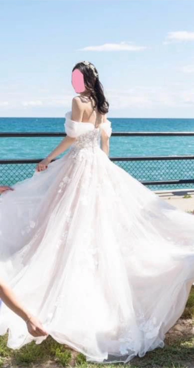 Paid $2000. The brand is Essence of Australia. The off-shoulder straps are from Pronovias. Worn once on my wedding. Bustle added. Back bottons upgraded and replaced with zipper. Size 2-4 Pick up at Yonge/Finch area. No try on due to privacy concerns. Thank you!