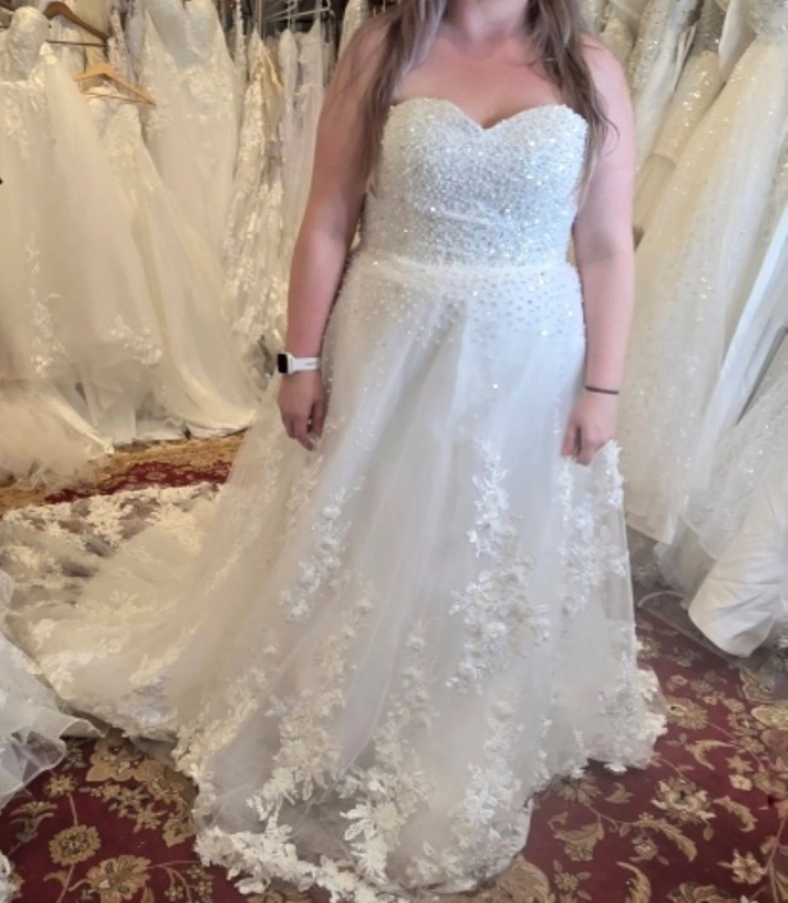 Beautiful ivory wedding dress with delicate beading and lace details! The dress features a strapless, sweetheart neckline and a fitted bodice that flows into a full skirt. The back has a corset lace-up closure. It's adorned with intricate floral lace appliques and shimmering beads, adding a touch of elegance and sparkle. There is a small spot by hips a moth got stuck in that needs a bit of touch up, barely noticable. Few beads fell off throughout the day but again, is barely noticable - if at all! Veil with comb can be included, it is long and beaded