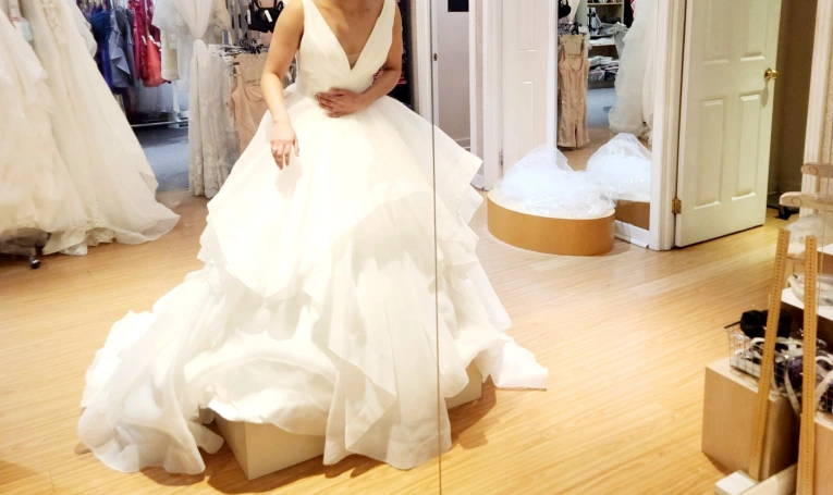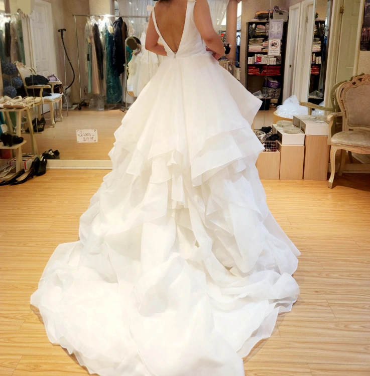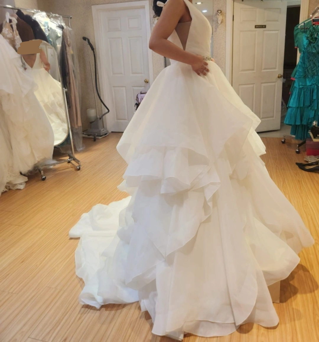 A beautiful ivory wedding dress with a layered skirt, mesh on the sides and front and a deep V back opening. It's brand new and ready for your special day! *Embelished belt not included