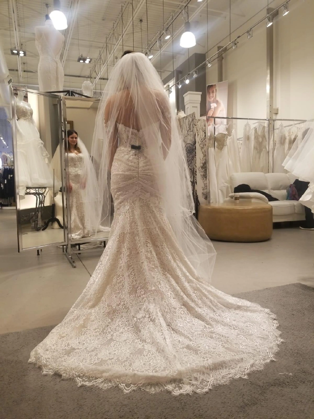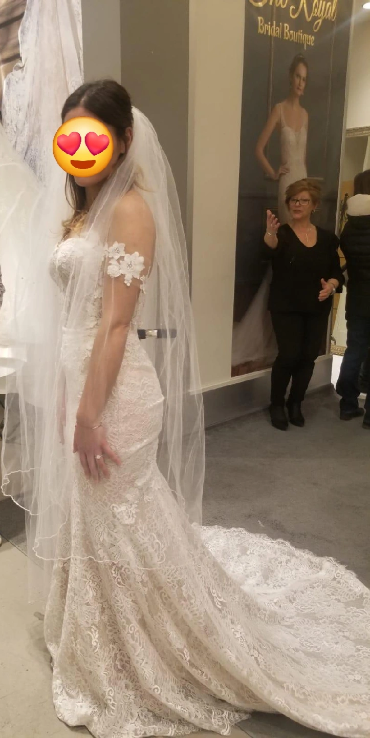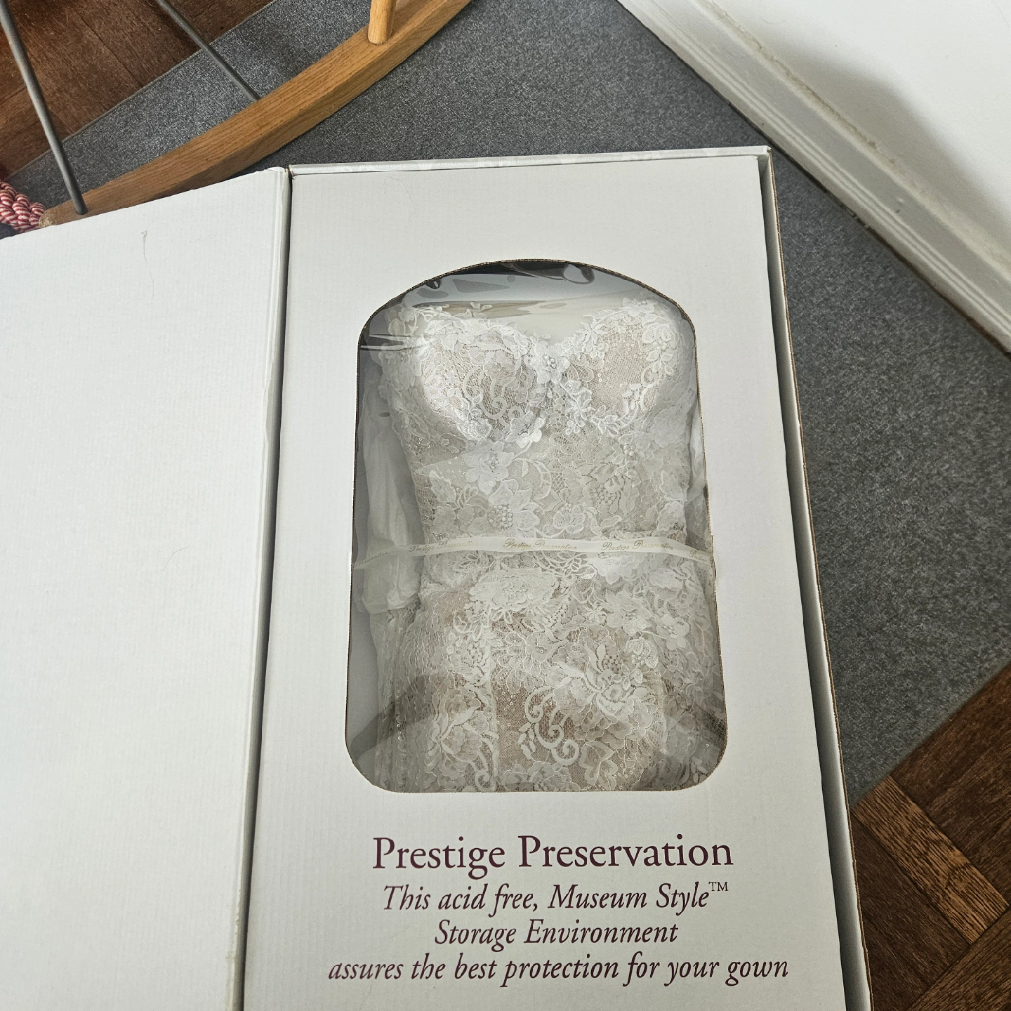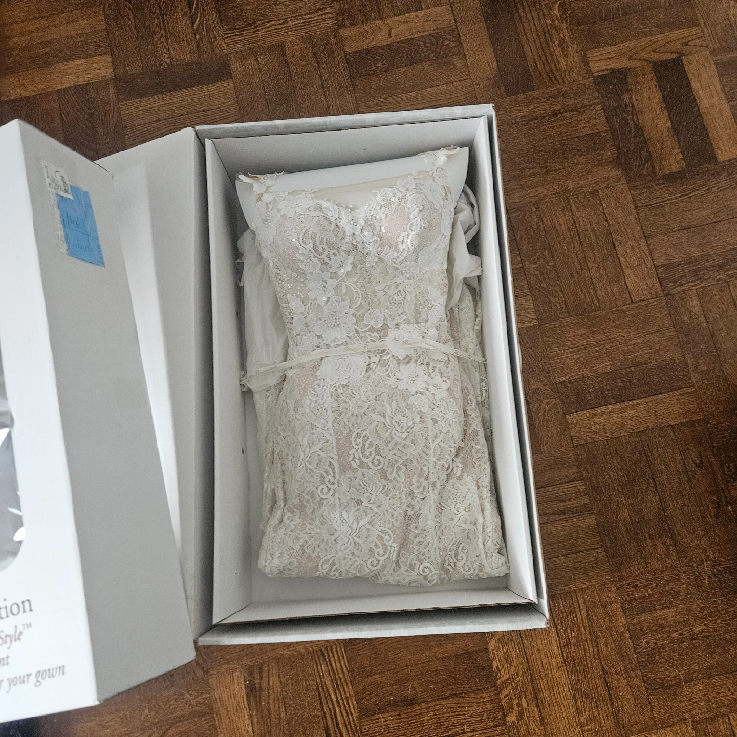 Selling a wedding dress in excellent condition. It comes with a box for preservation. Beautiful lace dress, off shoulder and gorgeous ruched back. The pictures do not do any justice, the dress also sparkles.