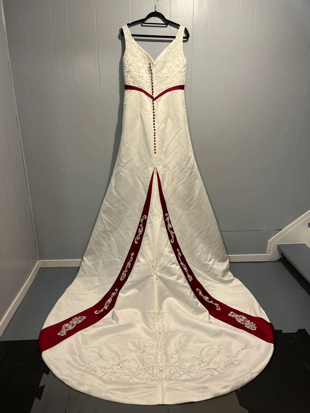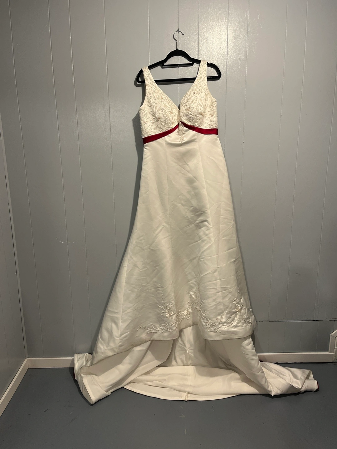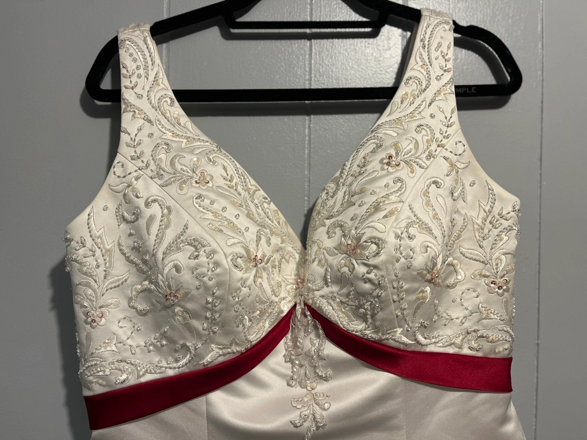 White wedding dress with red ribbon accents and beaded embellishments. The dress is floor length and features a V-neckline and a fitted bodice. It is sleeveless and has a zipper closure in the back. States size 16, however I was size 12 when I wore it. $80 OBO